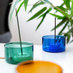 Green glass incense burner. Adds a natural and harmonious touch to any setting. Ideal for décor, yoga, or wellness stores. Made from heat-resistant glass and easy to maintain.