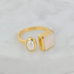 A stunning piece from our pearl collection. This ring showcases two captivating pearls. Whether worn solo to make a bold statement or paired with other accessories for a chic and stylish look the Hariette Pearl ring is a must have piece.