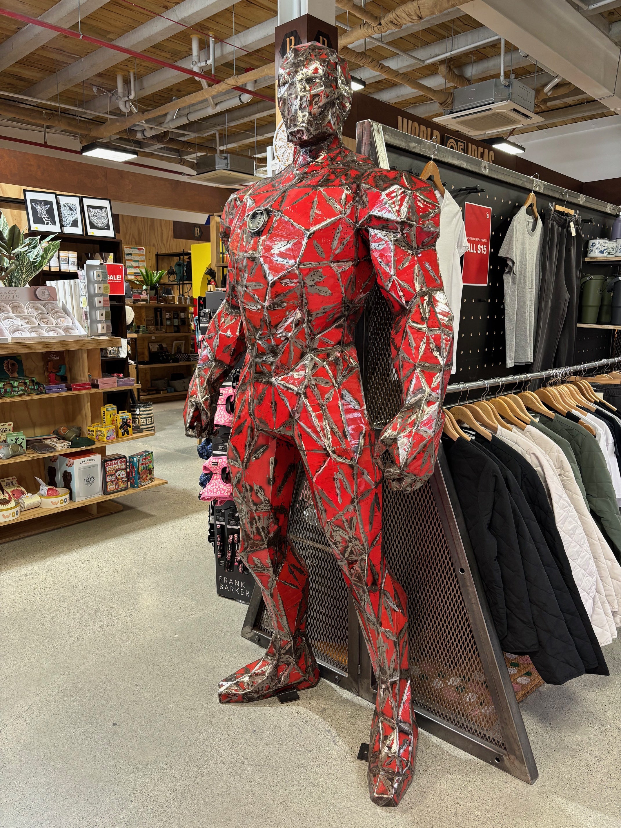 Fantastic recycled, pop art sculpture of a superhero.