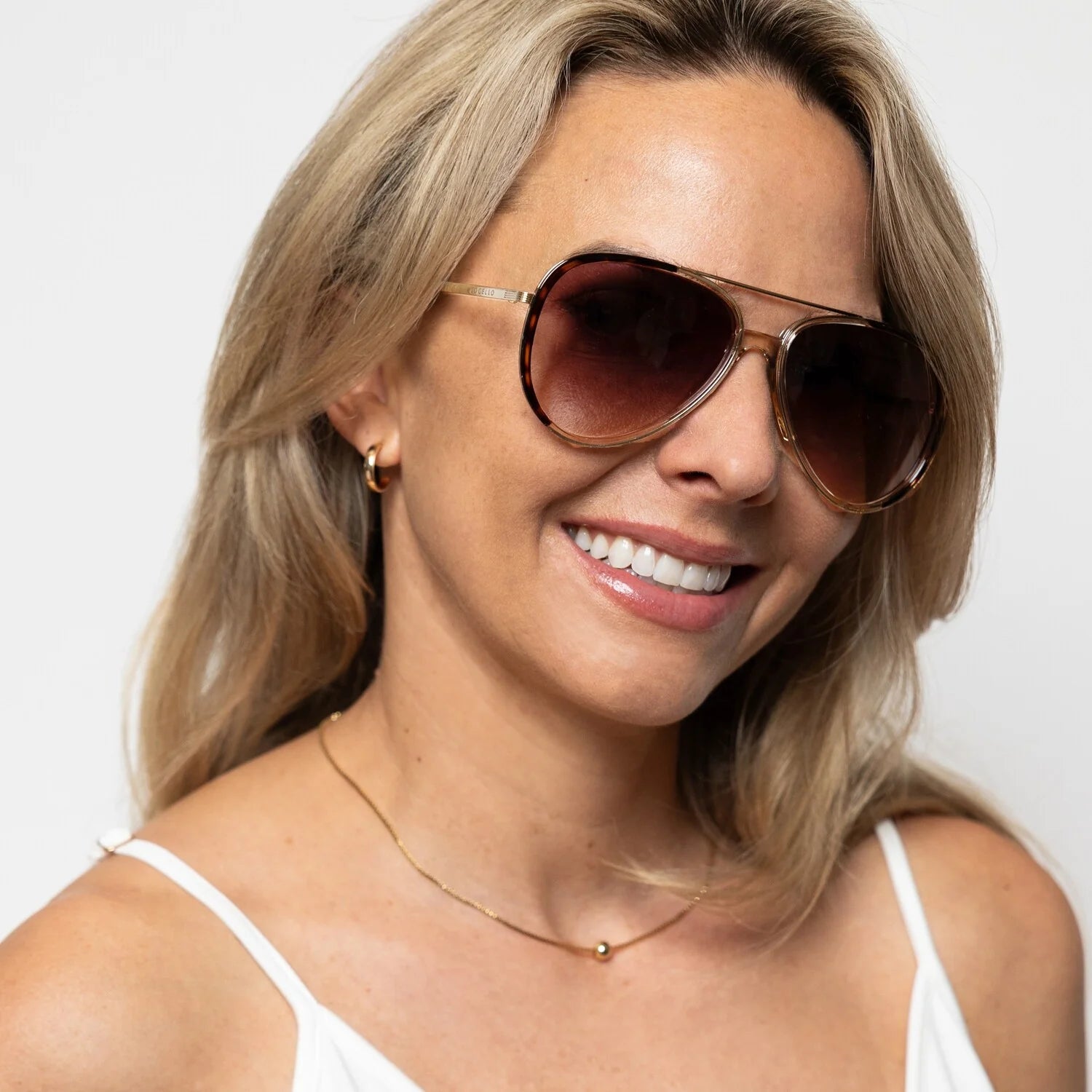 With Lexie as your new wing woman, you can soar with style. Lexie’s gold frame combined with a tantalising tea tortoiseshell delivers an exciting mix of modern and retro looks, making her an instant head-turner. But these shades aren’t just all looks; they take sun safety seriously, with 100% UV protection thanks to their brown gradient polarised lenses. Trust us, once you get your hands on these aviators, you won’t want to leave the house without them.