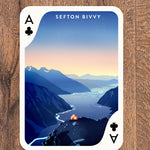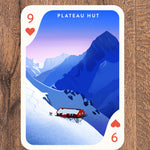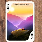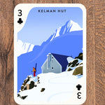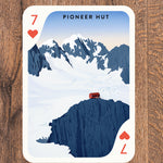 A premium set of gold edged 350gsm playing cards featuring 14 unique full colour illustrations of South Island Backcountry huts.