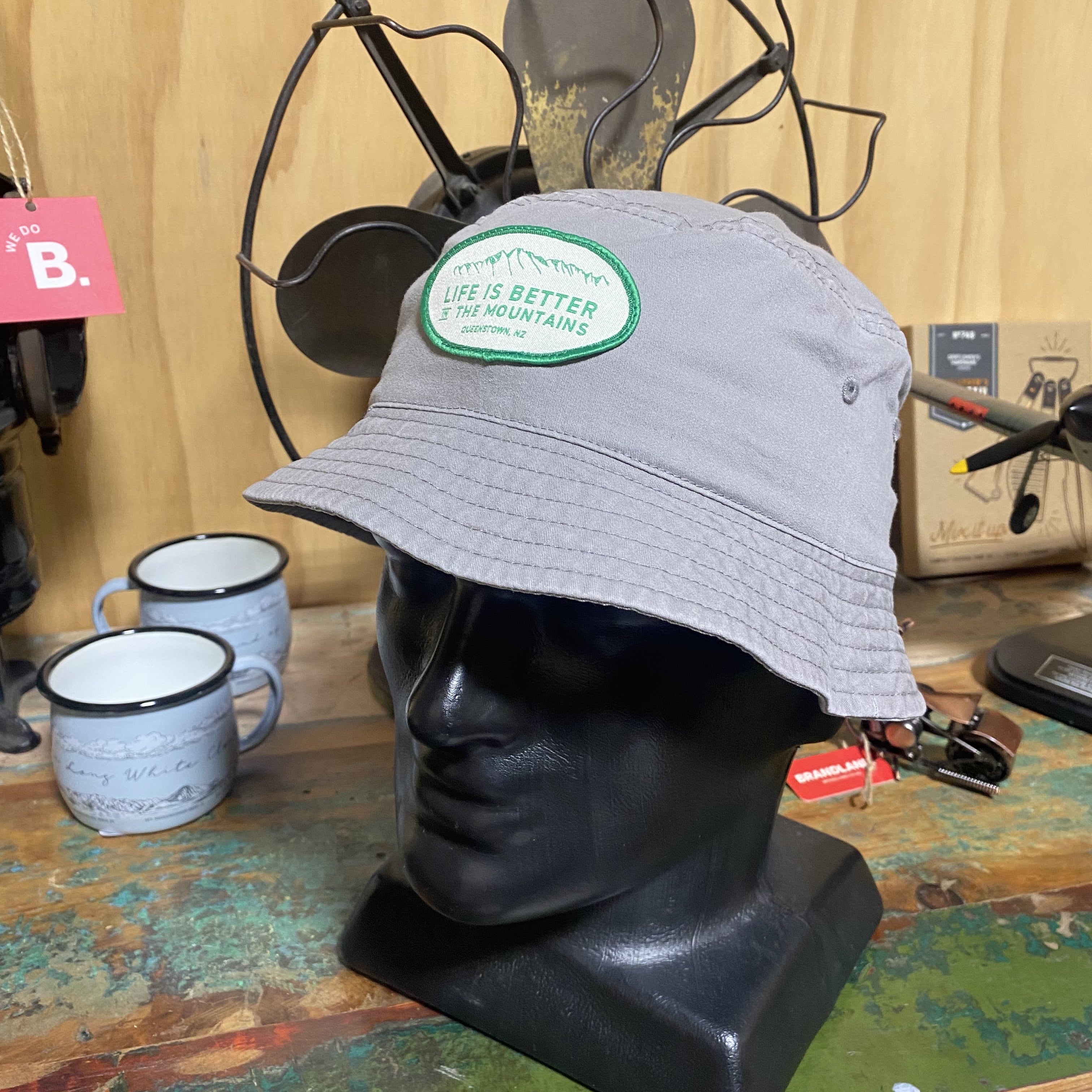 Life Is Better Faded Grey Bucket Hat (Green Patch)