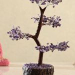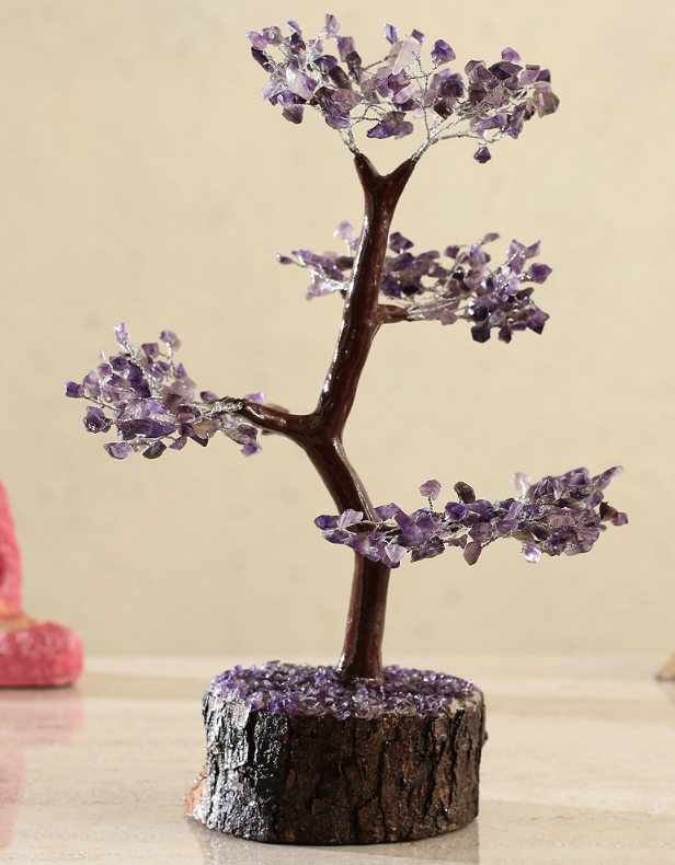 Amethyst 360 chip gem tree with a natural neem base with Gems on top. Made from real gemstones, a wish tree is one-of-a-kind hand crafted piece.