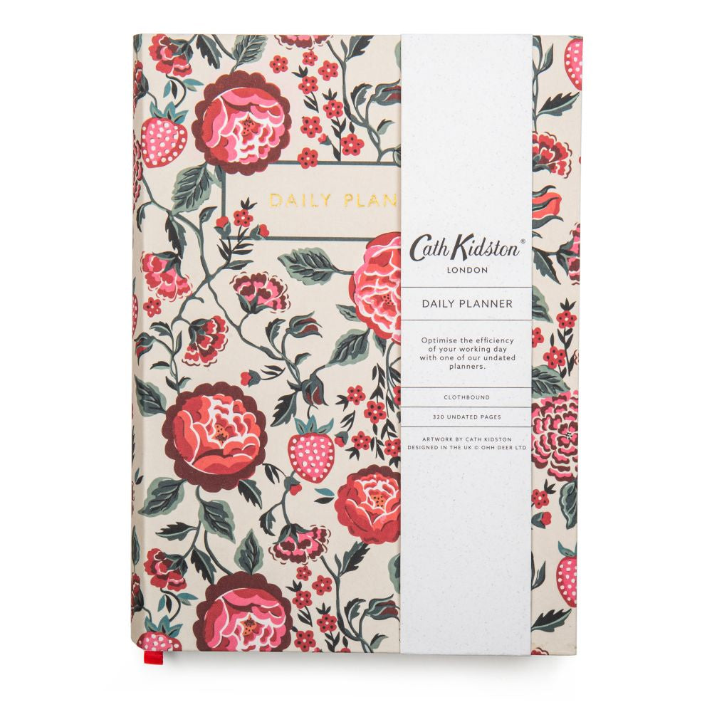 Cath Kidston daily planner with linen cover Semi flexible cover (linen mounted to 2mm greyboard) Gold foil lettering on cover Undated day to a page format with notes page opposite Life organiser details on each page... to do list, today's objectives, appointments, priorities, etc Soft grey printed lines and type Satin ribbon page marker Sustainably sourced paper 380 pages 16 x 21.5cm x 2cm thick