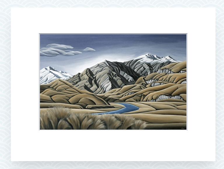Inspired by the rugged beauty of New Zealand, her paintings bare the landscape down to its most simple form to reveal the essence of the land beneath.