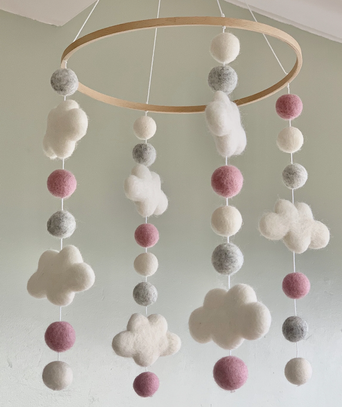Lovingly designed & constructed in New Zealand using 100% New Zealand wool components, hanging from a bamboo ring, SHEEP-ish Design Cloud mobiles are a beautiful addition to a nursery.