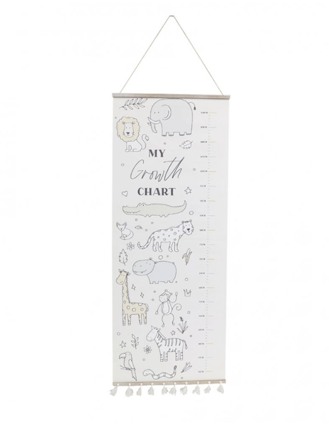 The Splosh Baby Range features a variety of charming African animal inspired keepsakes for little ones, designed to celebrate and treasure their first precious moments. Add a touch of pastel colour to any nursery with a special piece from the Splosh Baby Range! Features: Great decor piece for kids of all ages! Comes packaged in a custom colourfully designed box! Measures up to 150cm! Product Information: Packaging: Full colour printed box Size: 40 x 1 x 118cm Details: Printed canvas growth chart with white tassel detailing and tope for hanging, measuring up to 150cm in height