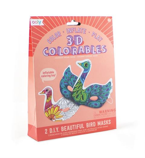 Accentuate your beauty with a colourful bird mask made by you. The Beautiful Birds Masks are part of the 3D Colourables family of inflatable colouring toys. Inflate with the included straw. Suddenly, your inflated creation becomes a beautiful mask. Beautiful Birds Masks comes with 2 different bird designs The masks measure at 20 x 18cm