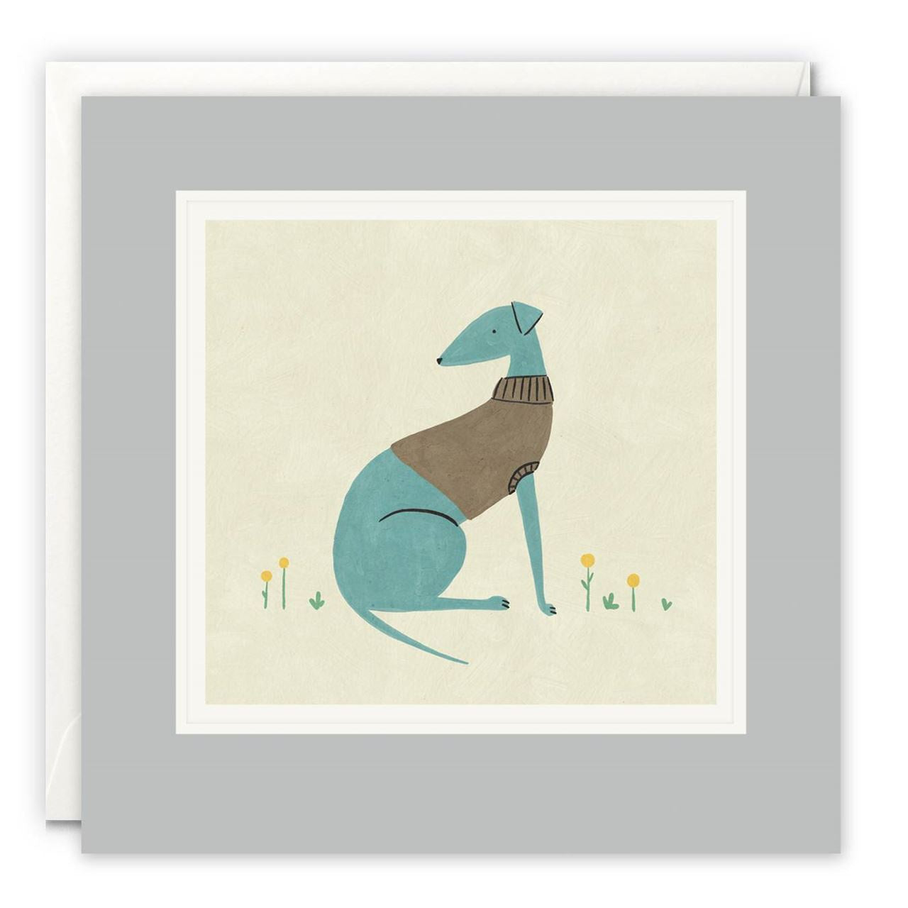 A high quality blank art card by Betsy Siber. The artwork on the front of the card features a blue dog wearing a brown jumper, sitting among little yellow flowers. It is titled 'Blue Dog'.