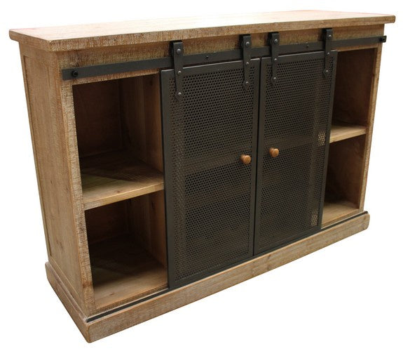 BUFFET WINE CABINET WITH METAL SLIDING DOORS THE RUSTIC METAL HARDWARE AND SLIDING BARN DOORS COMBINE STYLE AND FUNCTIONALITY. PERFECT FOR DINING AND ENTERTAINMENT AREAS FEATURES 4 SHELVES WITH HANGING WINE GLASS RACK IN CENTRE AND WINE RACK BELOW, MADE FROM OLD PINE AND ANTIQUE METAL Size: 1200x380x820