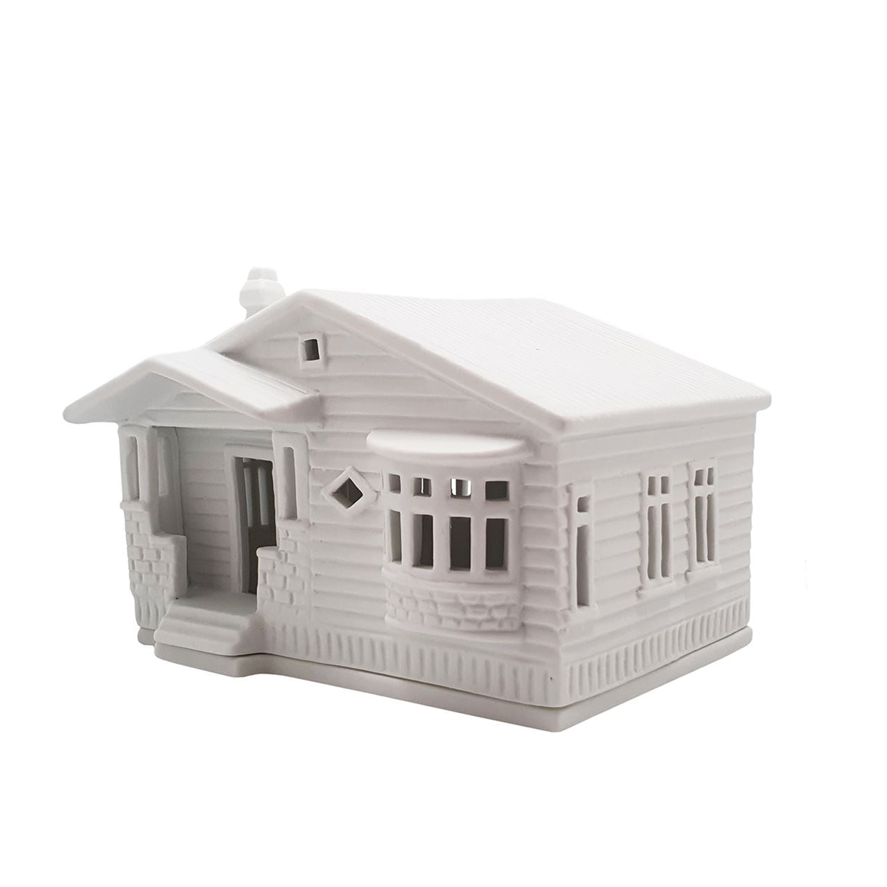 This charming porcelain Bungalow tealight house features intricate brick and weatherboard detail with steps leading up to a front porch and an ornate curved bay window.