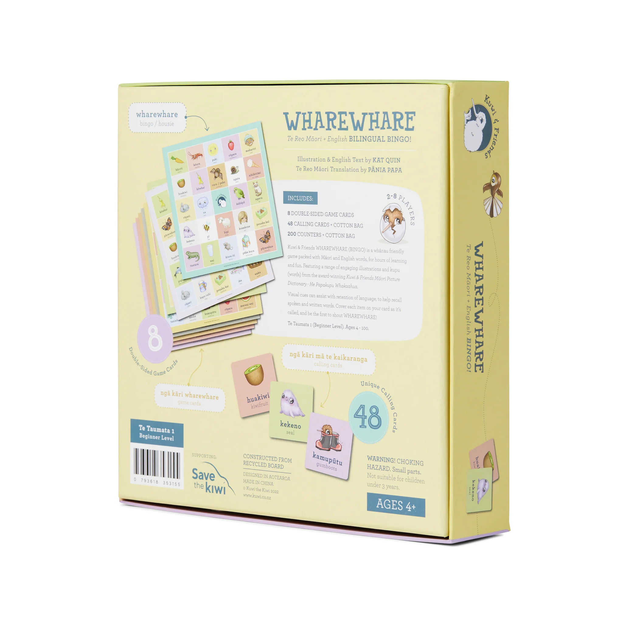 Kuwi & Friends WHAREWHARE (BINGO) is a whānau-friendly game packed with basic te reo Māori and English words, for hours of learning and fun. With glorious illustrations and kupu (words) from the award-winning Kuwi & Friends Māori Picture Dictionary - He Papakupu Whakaahua.