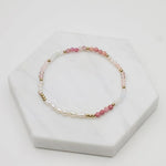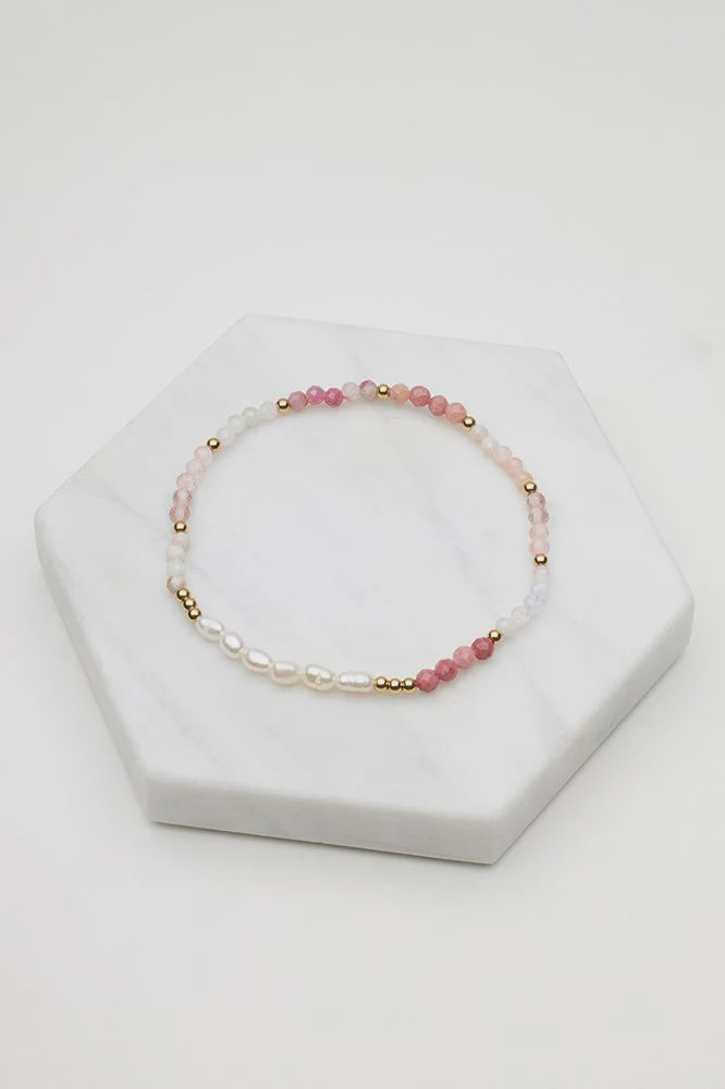 A stunning piece featuring a gradient of rose-coloured semi-precious stone beads, beautifully complemented by six freshwater pearls. This elegant combination creates a soft, feminine look with a natural, organic feel.