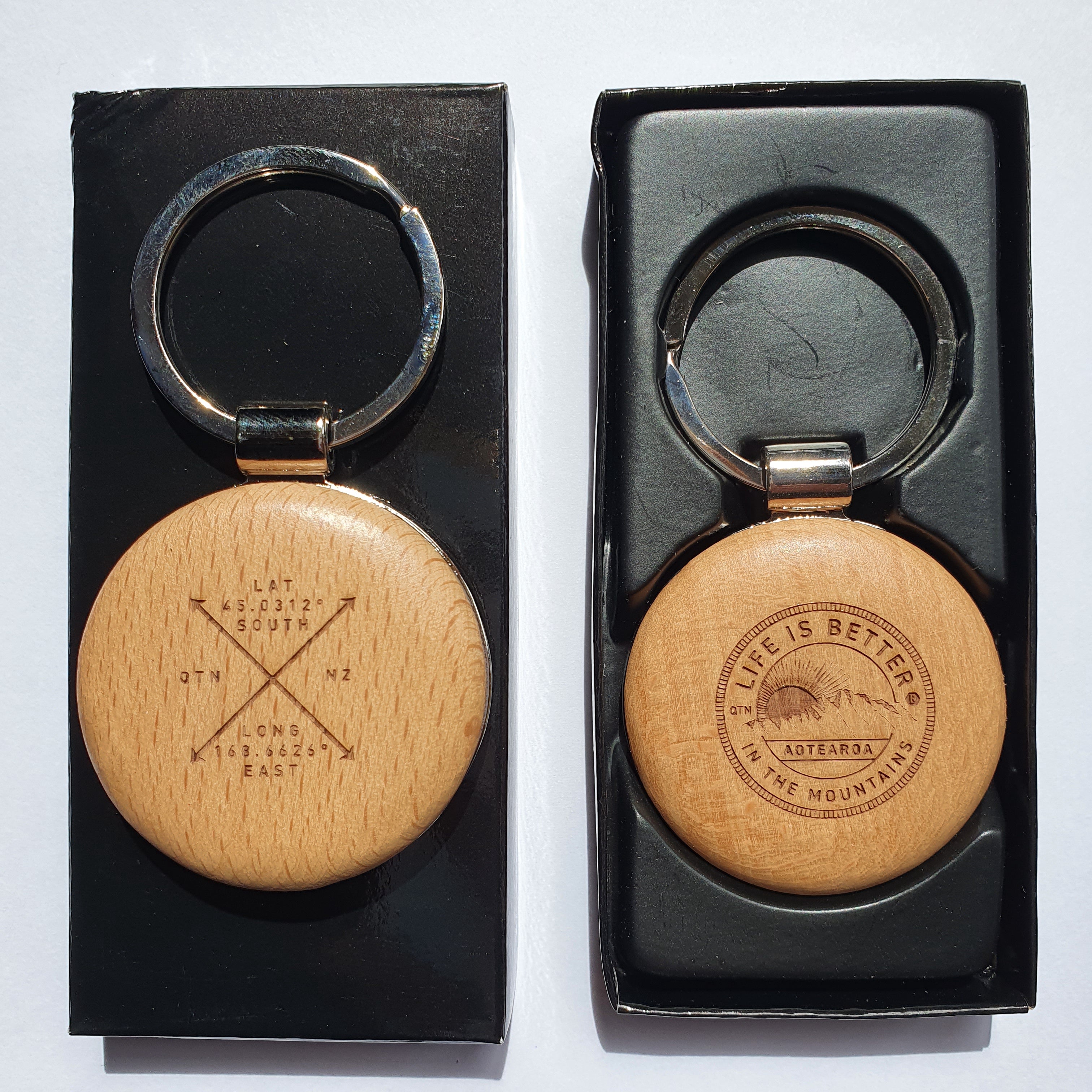Round natural beech wood key ring with decorative metal trim. Laser engraved on both sides and presented in a black gift box. Wood is a natural material which produces unavoidable variances in the grain pattern, colour and branding.