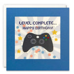 The text on the front of the card reads 'Level Complete... Happy Birthday!'. It is blank inside for your own message.