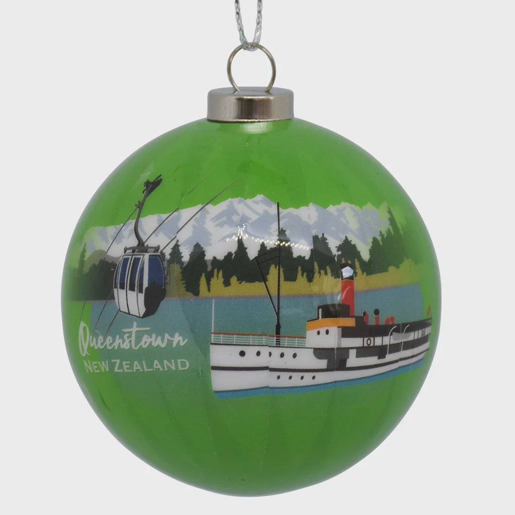 The bauble displays the fabulous TSS Earnslaw, the Queenstown gondola with Lake Wakatipu in the foreground and Walter and Cecil Peaks in the background