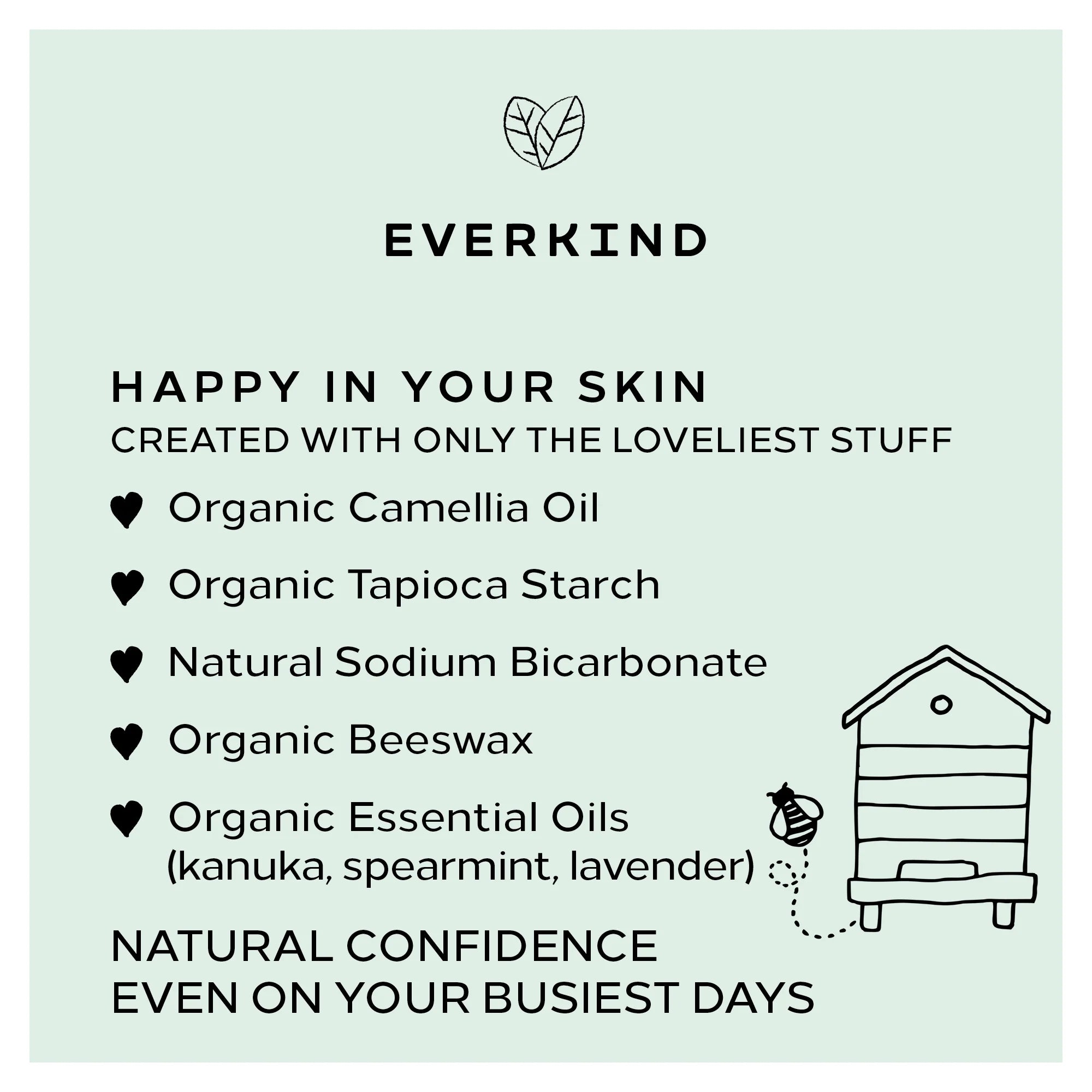 Organic camellia oil, organic tapioca starch, naturally occurring sodium bicarbonate and organic NZ beeswax, blended with NZ organic kanuka, spearmint and lavender true essential oils.