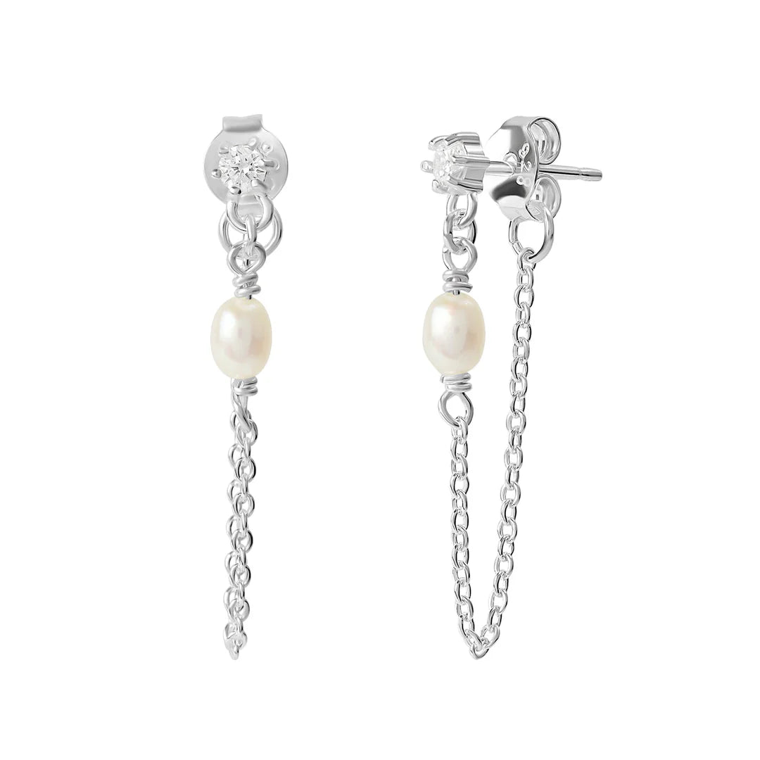 Elevate your elegance with our Sterling Silver Chained Pearl Studs, featuring a luminous freshwater pearl suspended from a delicate sterling silver chain. Each earring is also adorned with a sparkling cubic zirconia.