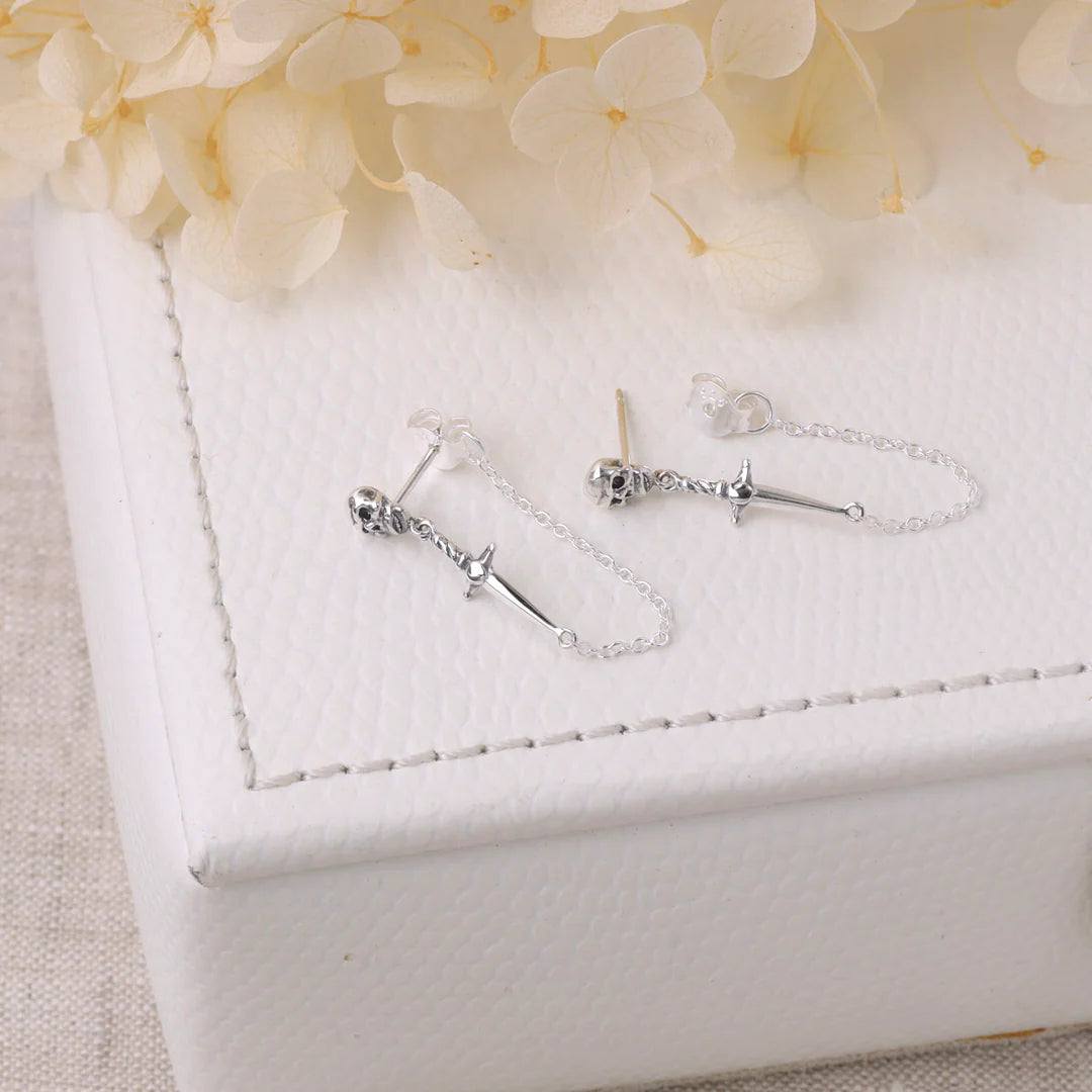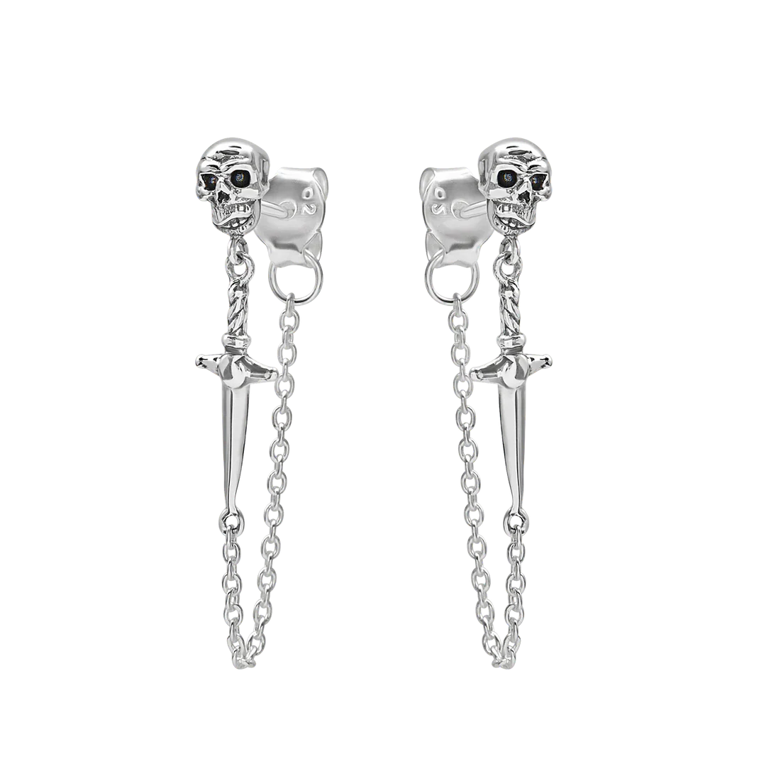 Edge meets elegance with our Skull and Dagger Chain Studs, embodying gothic allure with an intricate design and delicate chain.