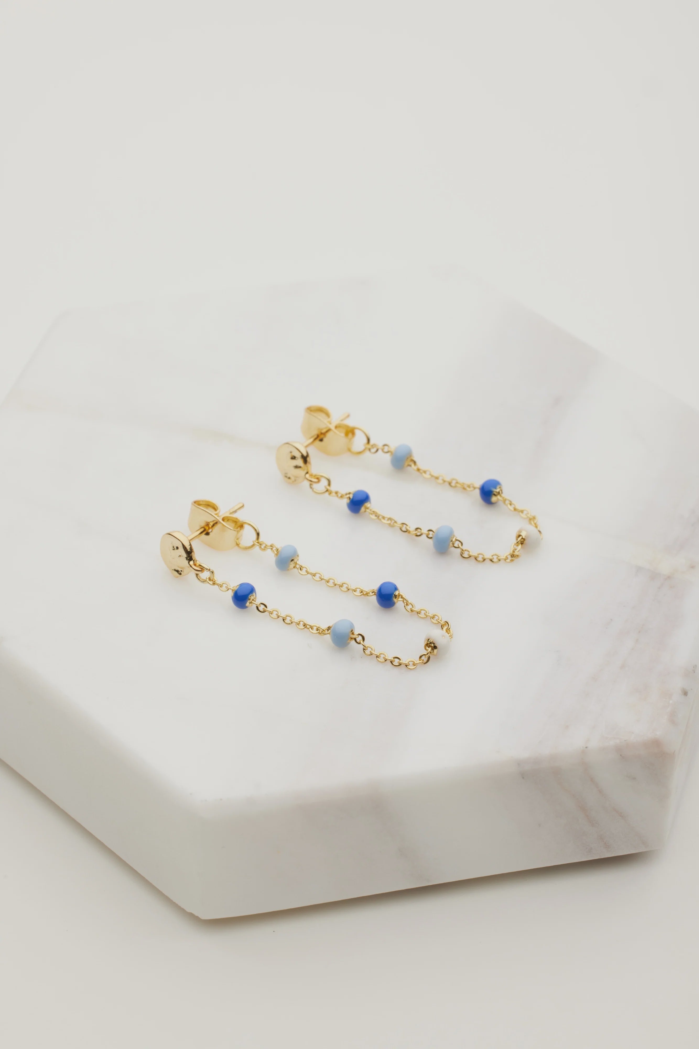 The Charlotte Earring in gold and blue enamel is a delicate drop design with a fun pop of colour.