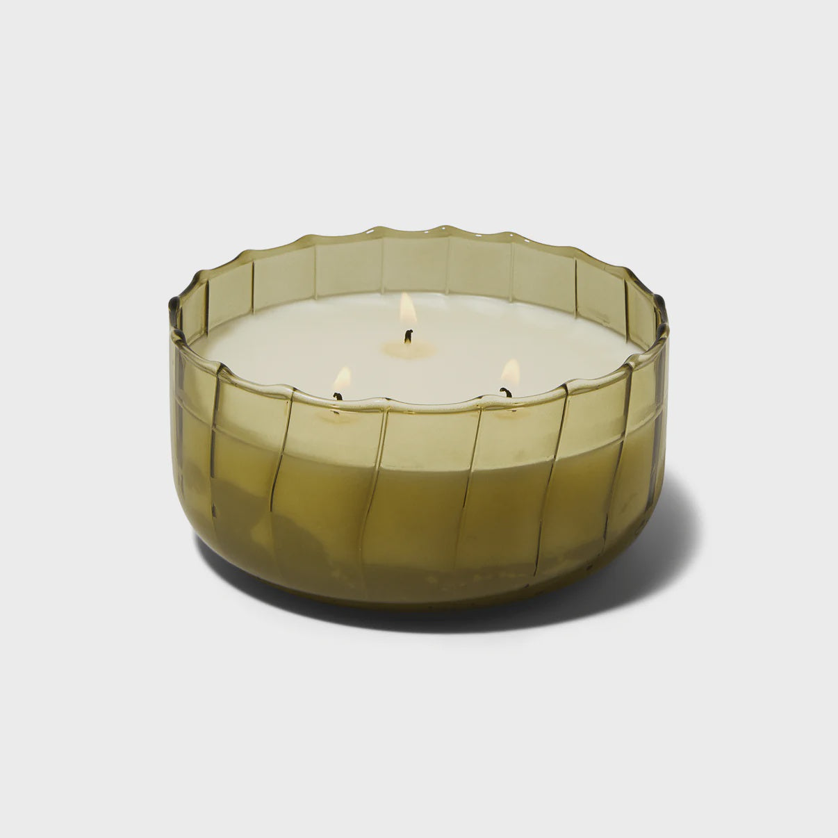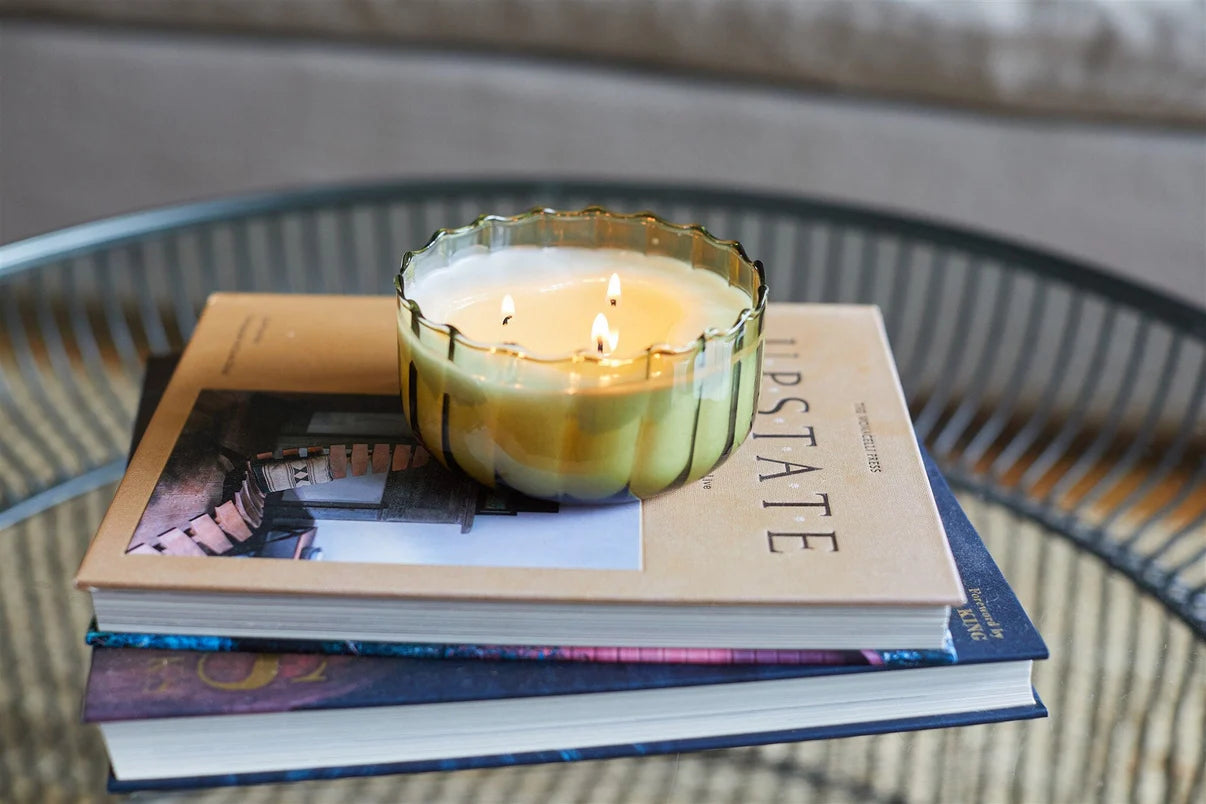 The Ripple - Secret Garden 12oz Candle is designed to elevate tablescapes.  Bring a vintage touch to your next dinner party with the subtle and finely ribbed colored glass vessels.