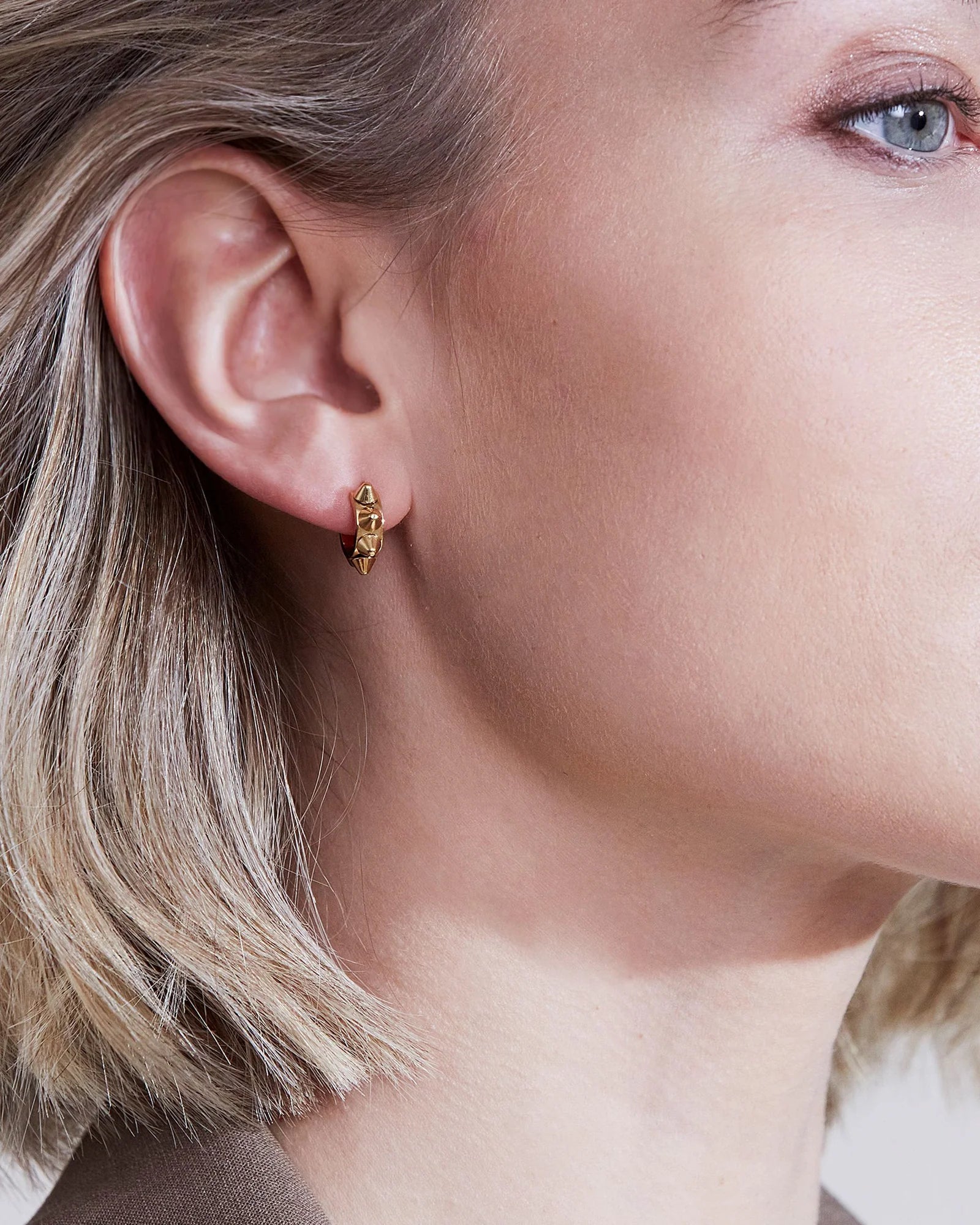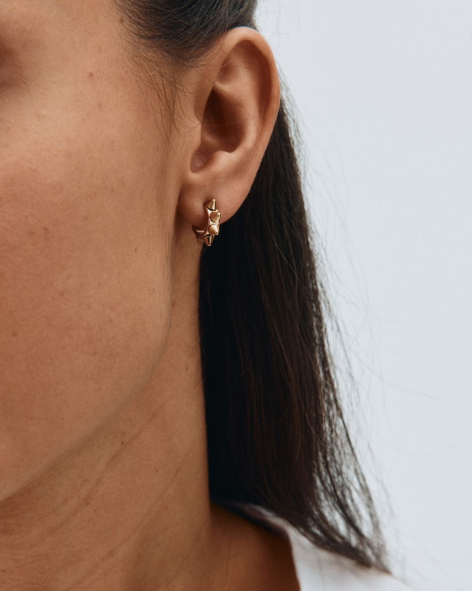 Our best-selling Peak series includes these chic, contemporary studded earrings. They look amazing when worn with other designs on the same ear. The Peak Creoles Mini Gold are shown here in polished 14K gold plate.