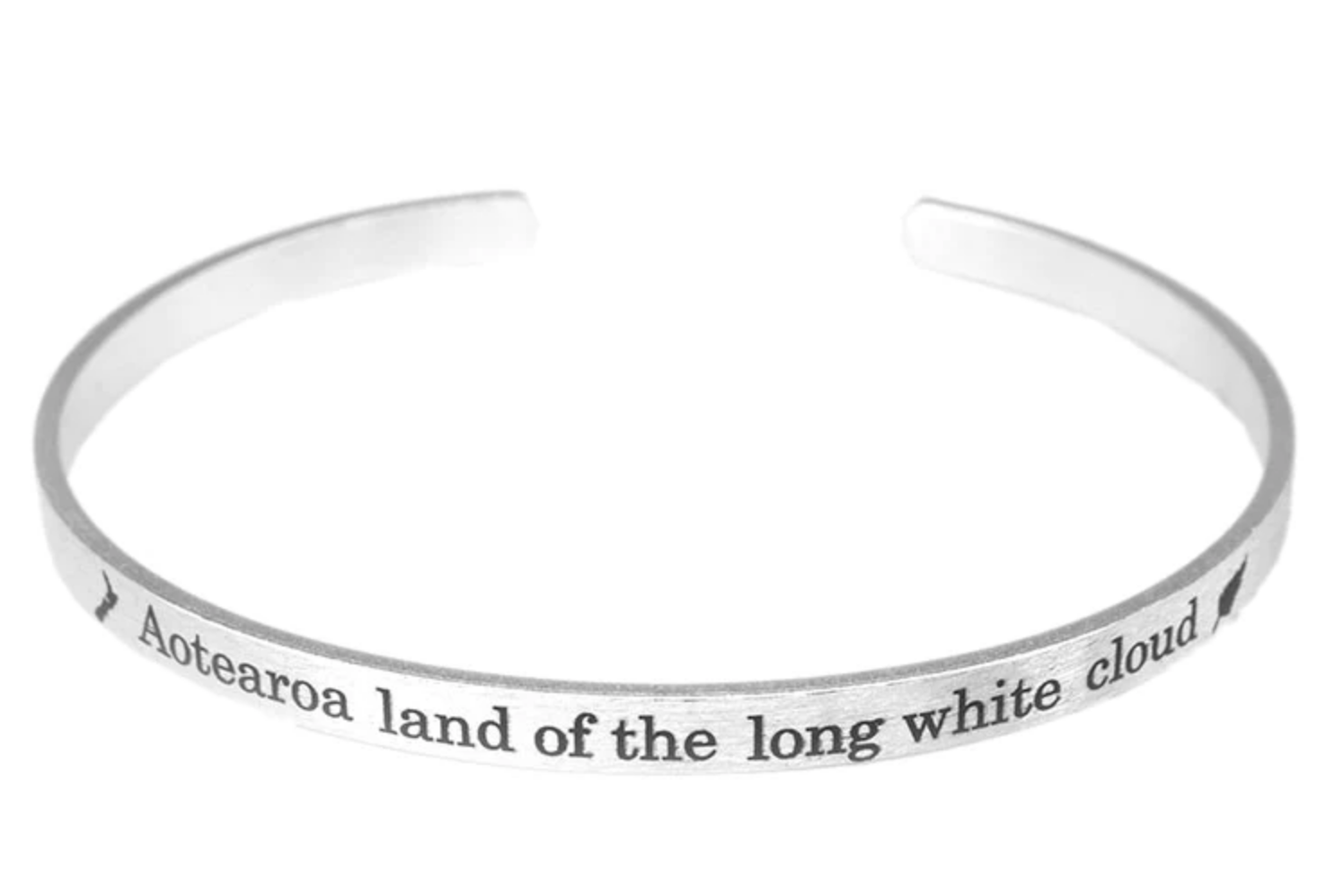 Aotearoa bracelet with embossed NZ map and silver fern.