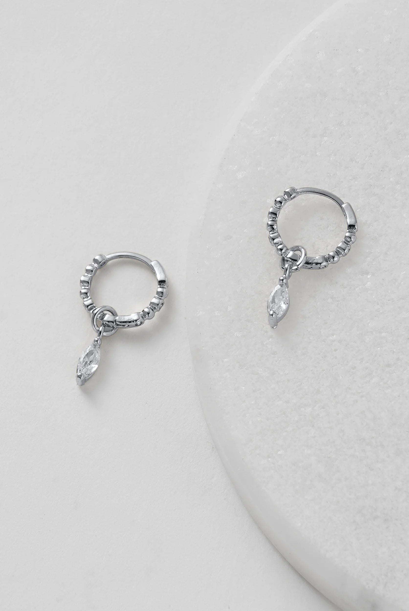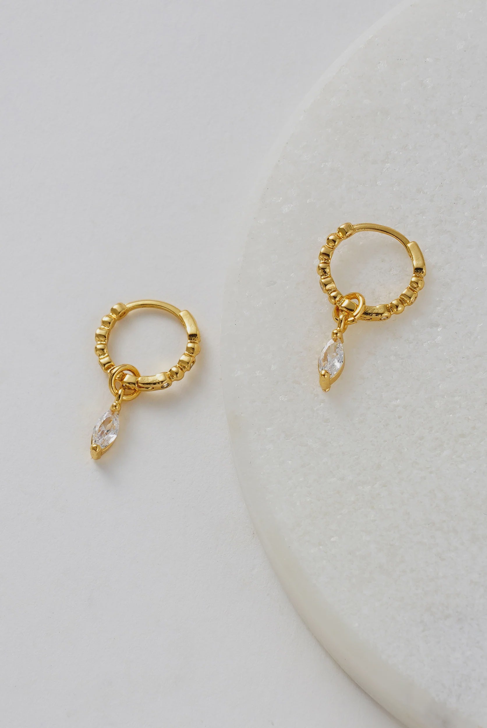 The Bridie Huggie is a delicate balance of texture and sparkle. Designed with a beaded gold hoop and finished with a marquise-cut crystal drop, this style adds effortless elegance to any look. Perfect for day-to-night wear, the Bridie Huggie can be worn solo as a statement or layered into your everyday stack for a touch of refined detail.