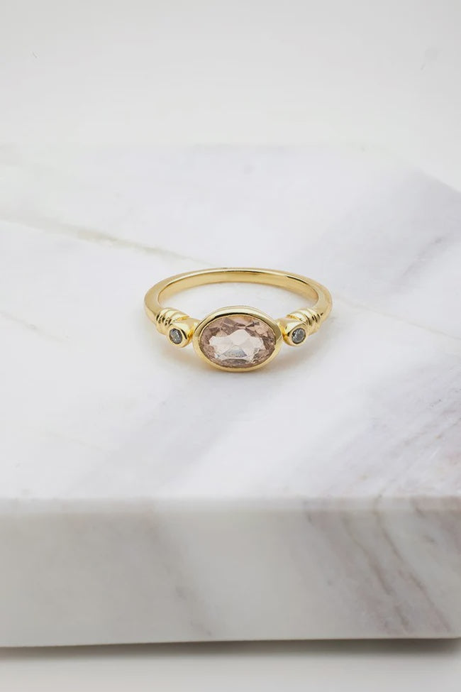 The Chloe Ring is a timeless design crafted to complete the Chloe set. Featuring a natural oval-cut Morganite at its centre, framed in polished gold and accented with two cubic zirconia side stones, this piece balances soft blush tones with a touch of sparkle. Elegant and versatile, it’s perfect for everyday wear or styled alongside the Chloe Earrings and Necklace for a coordinated statement.