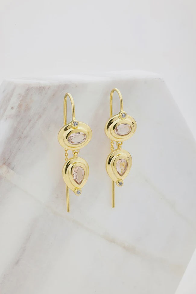 The Chloe Earrings bring a modern edge to timeless elegance. Featuring natural Morganite semi-precious stones in both oval and pear cuts, each piece is framed in polished gold with delicate thread-style drops for a refined, contemporary finish. Accented with sparkling cubic zirconia for an added touch of brilliance, these earrings are perfect for special occasions or to elevate your everyday look