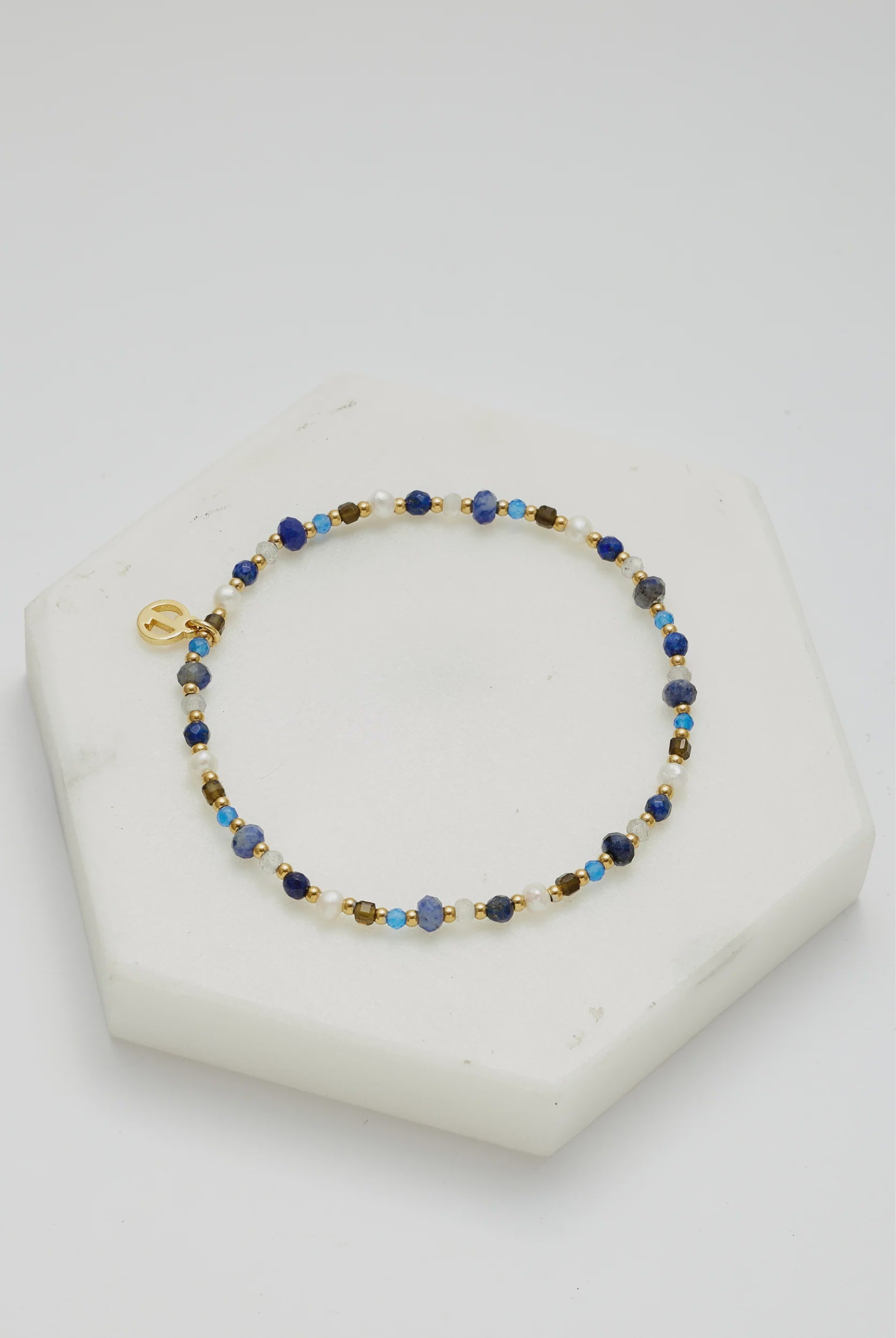 This bracelet features lustrous freshwater pearls combined with Navy-colored semi-precious stone beads, creating a stunning contrast of textures and colours. Crafted with meticulous attention to detail, the Harlow Bracelet showcases the natural beauty of these high-quality materials.