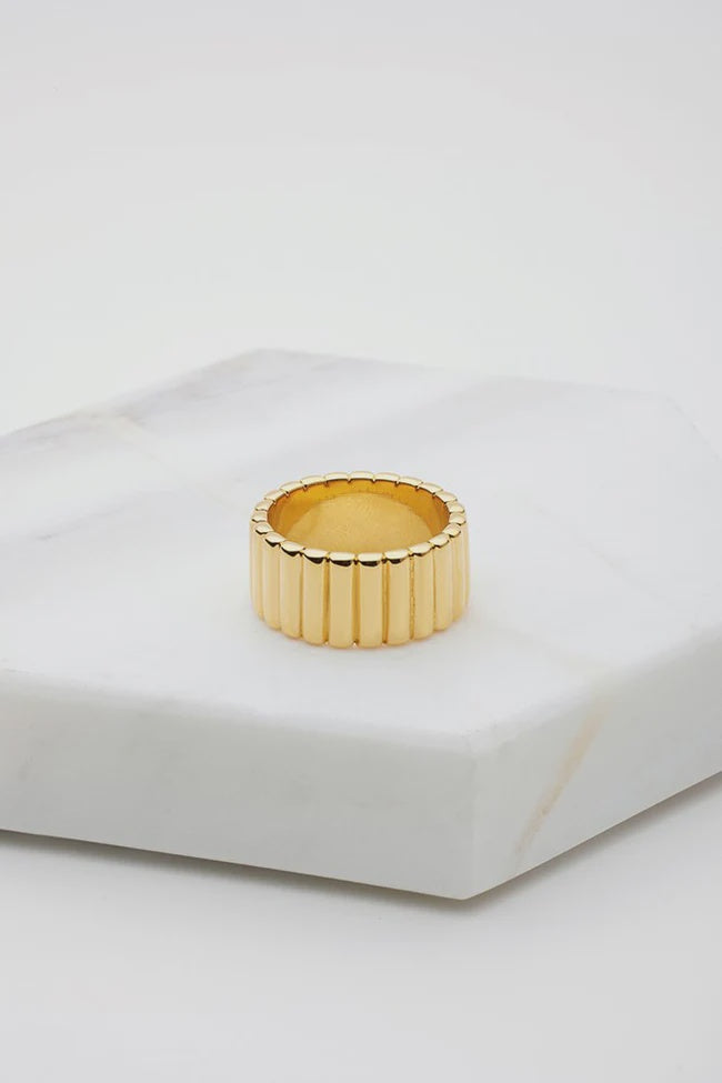 Bold yet refined, the Harlow Ring is crafted with a striking ridged design in polished silver tones. Its chunky silhouette makes it the perfect statement piece, while still versatile enough for everyday wear. Pair it back with our Harlow Hoops for a modern, coordinated look that balances edge and elegance.
