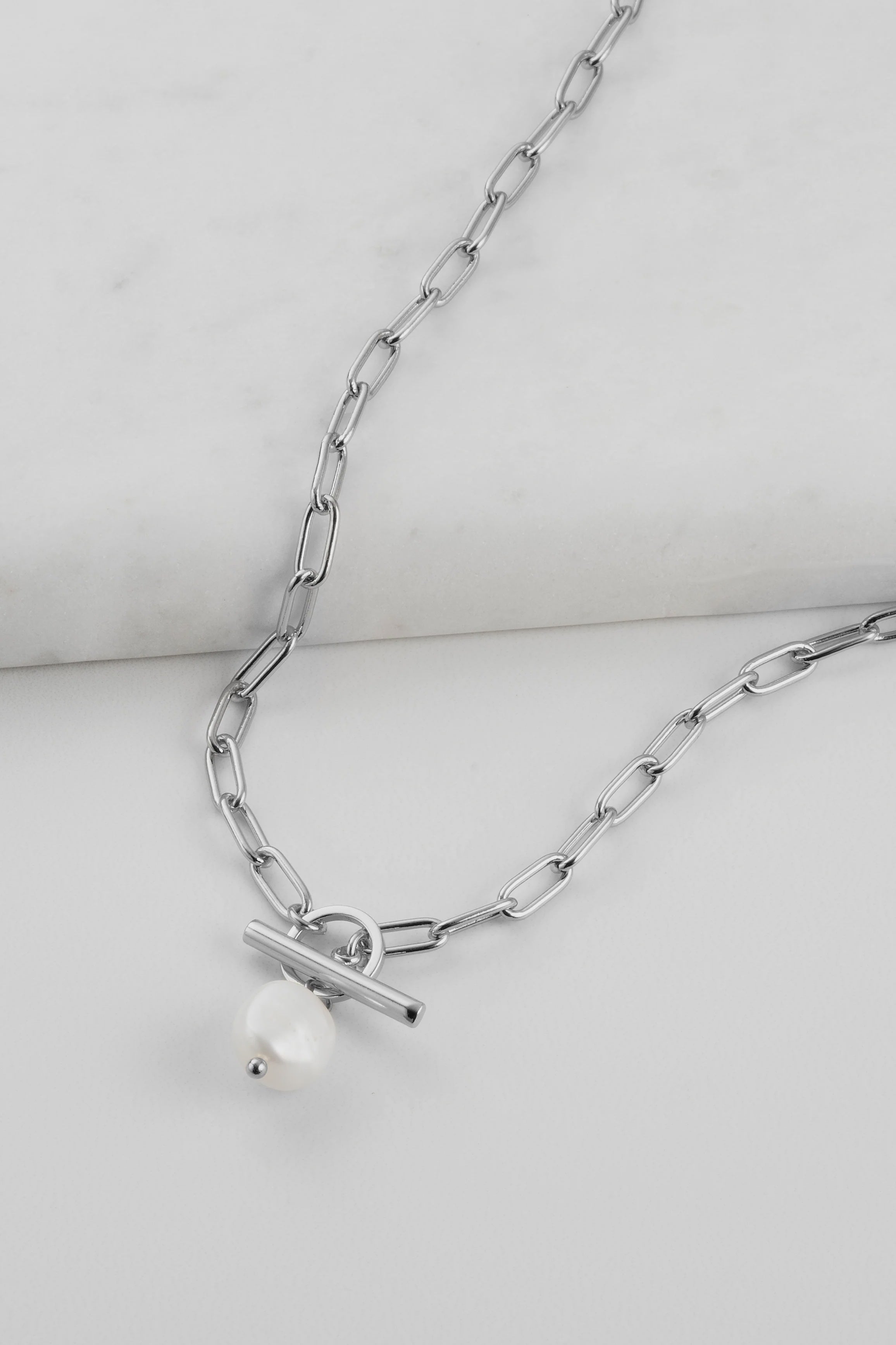 This necklace features a lustrous freshwater pearl delicately hanging from a fob pendant, which is attached to a sleek and delicate paper clip chain. The minimalistic design of the disk pendant allows the pearl to take centre stage and adds a touch of modernity to the overall aesthetic.