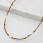 This beaded necklace features smokey-coloured stones, creating a beautiful contrast and adding a sense of depth to the design. The combination of natural stones and pearls adds a luxurious and refined touch to any ensemble. The Monique Necklace is meticulously crafted, ensuring each bead is carefully selected for its quality and unique beauty. Its versatility allows it to be worn alone as a statement piece or layered with other necklaces for a trendy stacked look.