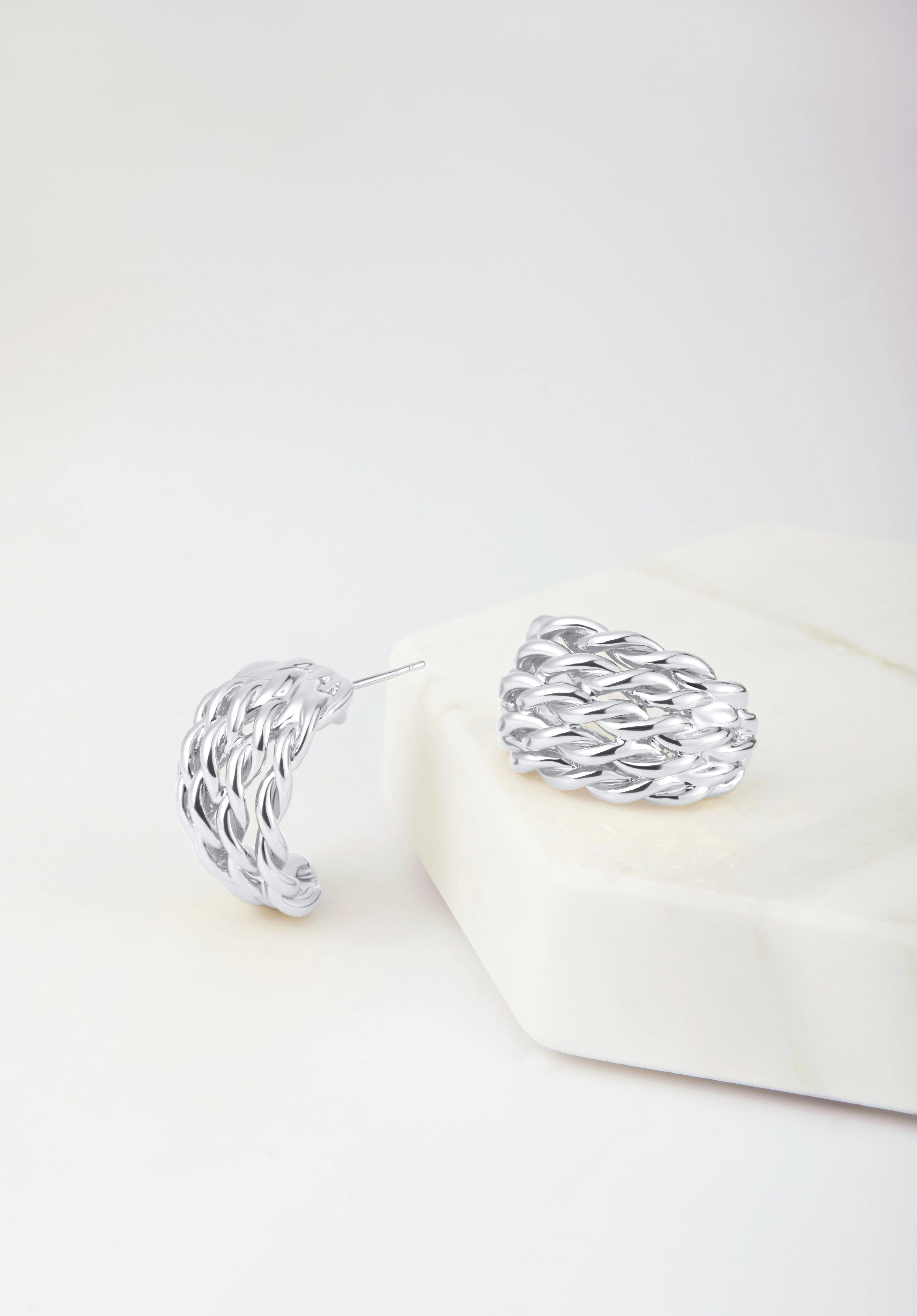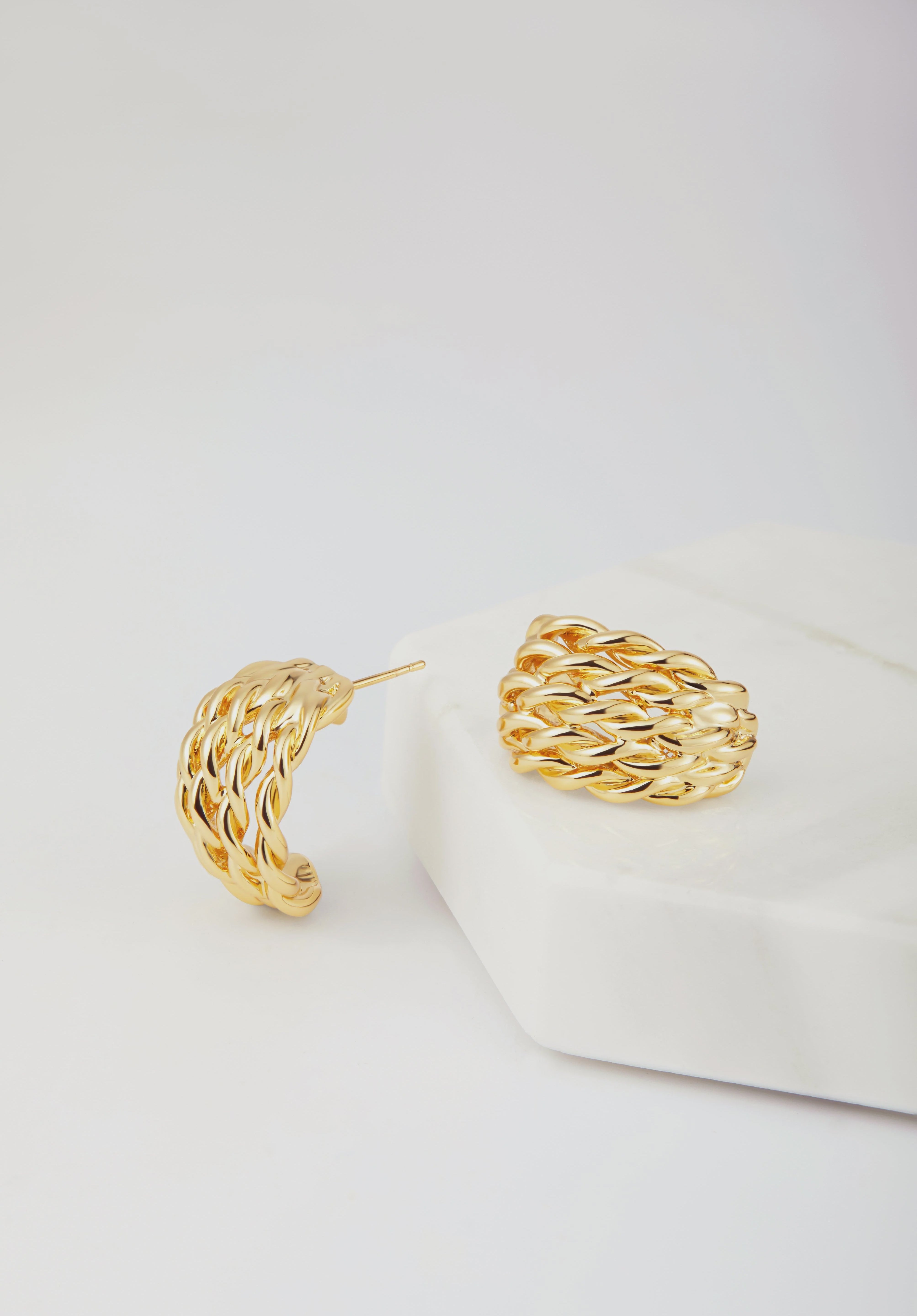 Introducing the Sarah Hoop – a statement hoop which features a braided pattern and a half hoop. These lightweight earrings will take you from day to night and add a touch of vintage style to any outfit. Inspired by vintage summers gone by, this piece redefines style with a timeless allure, effortlessly capturing the essence of sophistication.