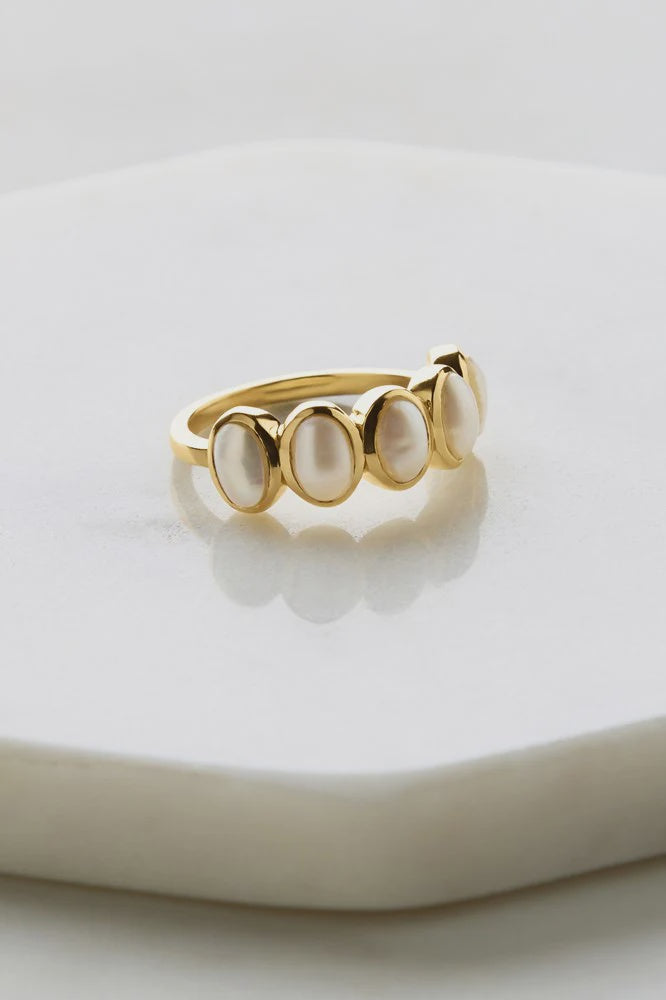 Elevate your elegance with the Sienna Ring, a statement cocktail ring featuring five lustrous freshwater pearls arranged in a harmonious blend of classic beauty and modern sophistication. Crafted with precision, it boasts a luxurious 2-micron layer of 18K gold plating, enhancing its durability and adding a touch of timeless glamour.