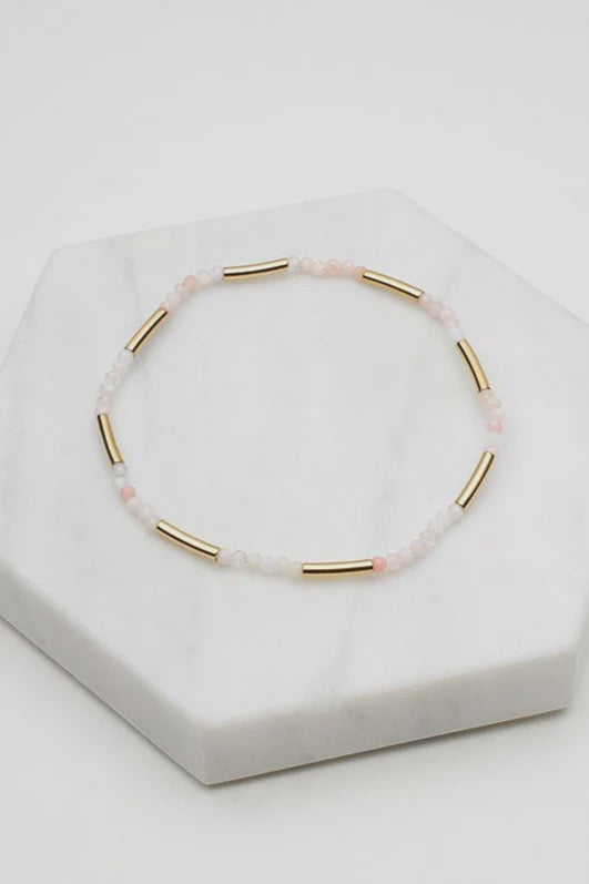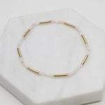 Romantic and refined, the Tilly Bracelet in Dusky Rose by Zafino is the perfect balance of soft femininity and modern styling. Crafted with delicate semi-precious stones in gentle blush tones, it’s finished with sleek gold-plated tube beads for a luxe contrast. With an elastic fit and fully waterproof design, this piece is made to move with you — from beachside mornings to sunset drinks.