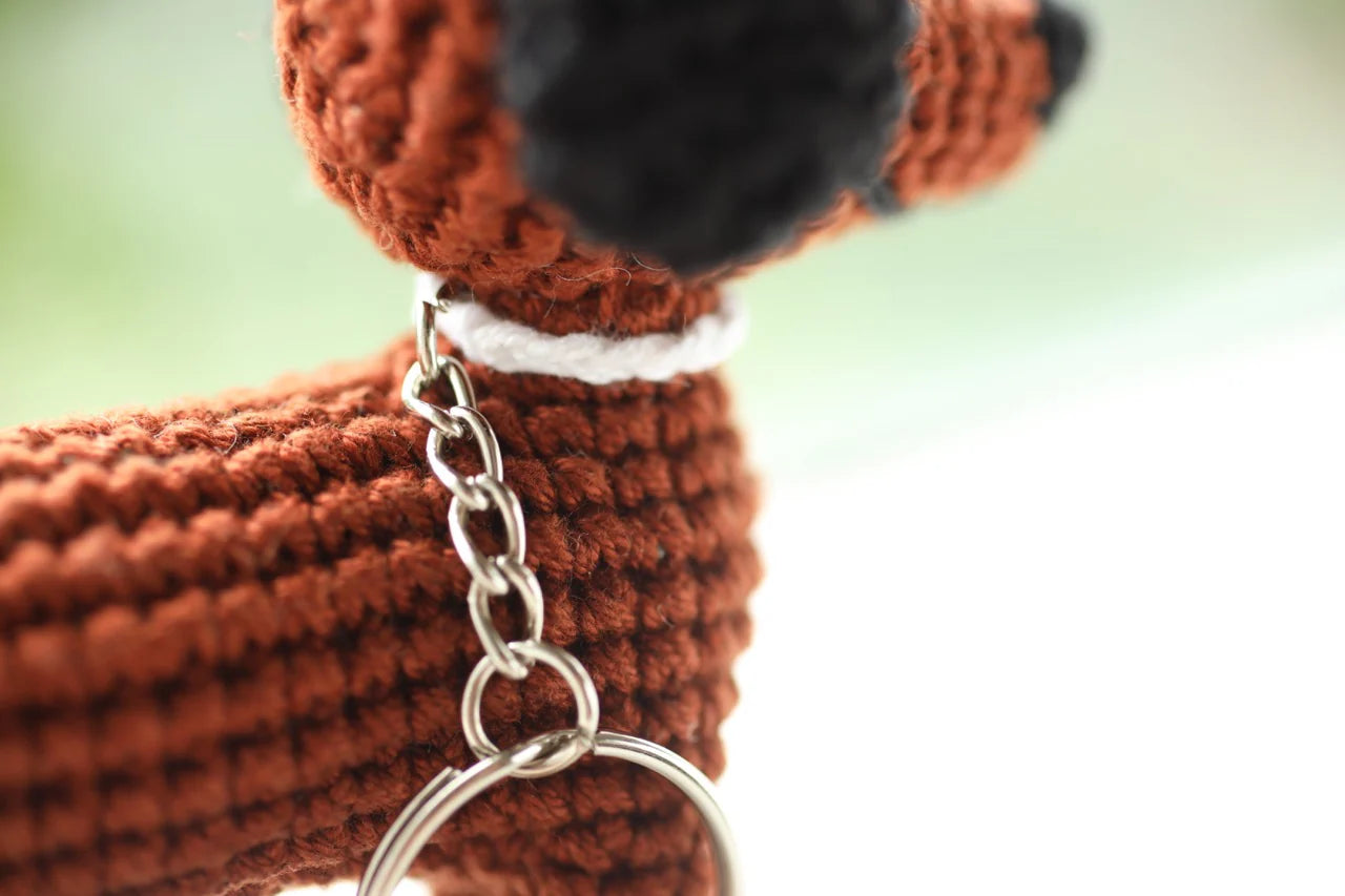 Materials: 100% cotton, plastic safety eyes, polyester fill, metal ring and chain