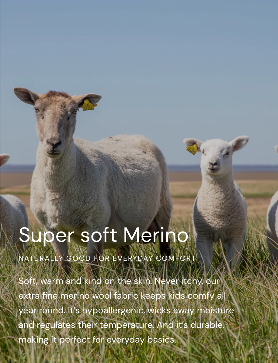 We use extra fine 100% merino wool, it's nearly four times finer than the average human hair. This means it's incredibly soft against the skin and never itchy. Merino is inherently breathable and temperature regulating, keeping babies warm in cold temperatures and cooler in warm temperatures, this makes it a great year-round daily choice as well as being perfect for sleeping in. It also wicks excess moisture away from the skin, is hypoallergenic, and odour resistant, keeping skin comfortable and dry day and night. Merino wool is also an environmentally responsible choice, being a natural, renewable, and biodegradable fibre.