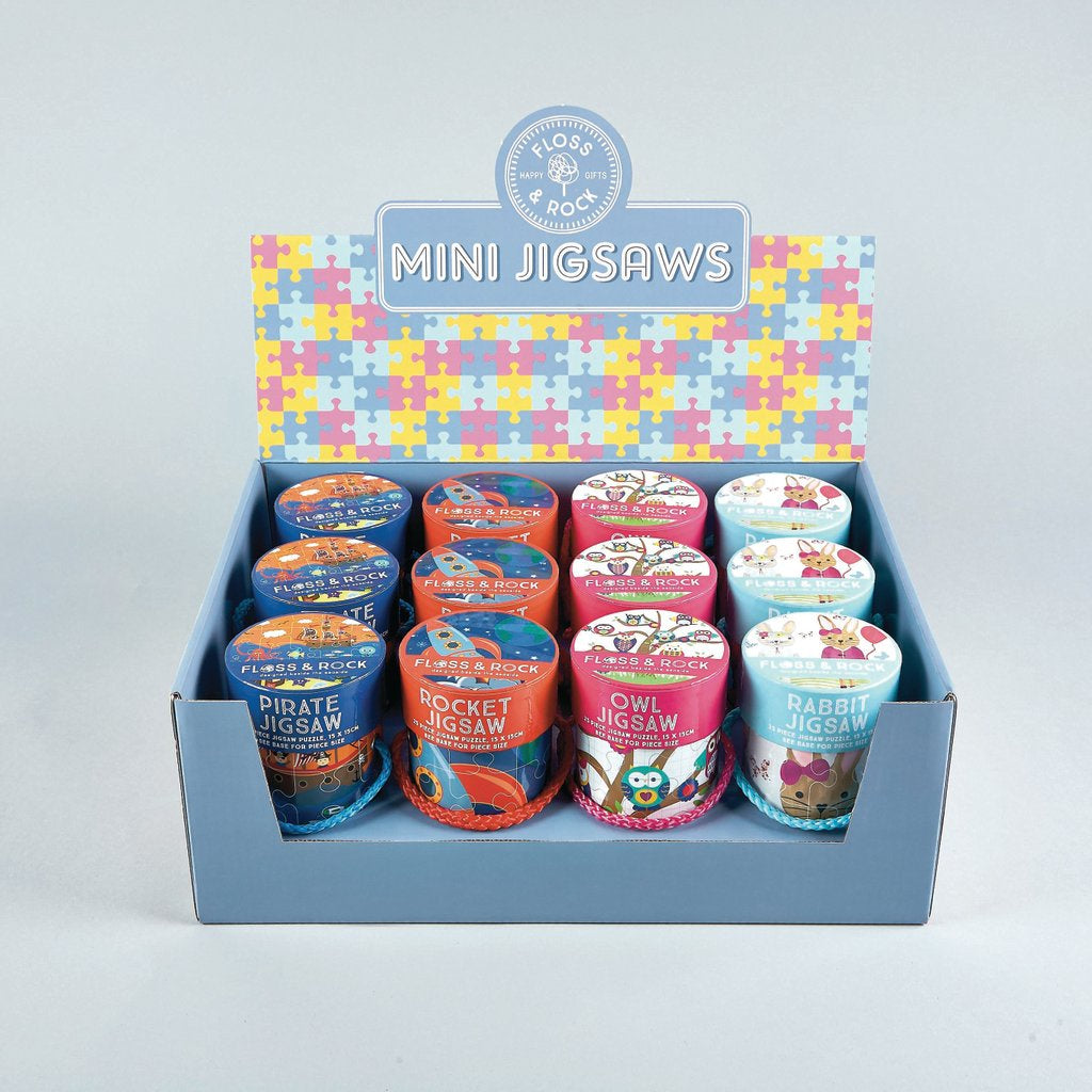 Counter Display Unit holds 12 mini jigsaws, 3 each of 4 designs. Each 25 piece puzzle comes packaged in a cardboard tub measuring 70mm diameter x 110mm high.