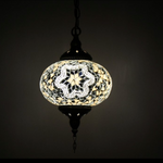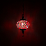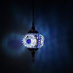 Turkish Mosaic Hanging Lamp Medium. Beautiful hung in the corner of a room. Spheres of colour reflecting off other surfaces is so lovely to see and has such a calming effect. This enchanting hanging light is ready to be wired to your ceiling. Lamps are handmade so there may be small variations. Approx dimensions 18 c 149cm, globe size is 17cm. Chain is 104cms.