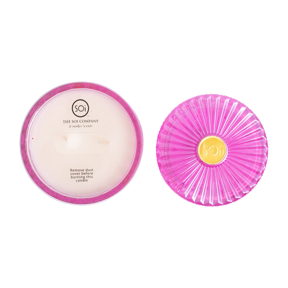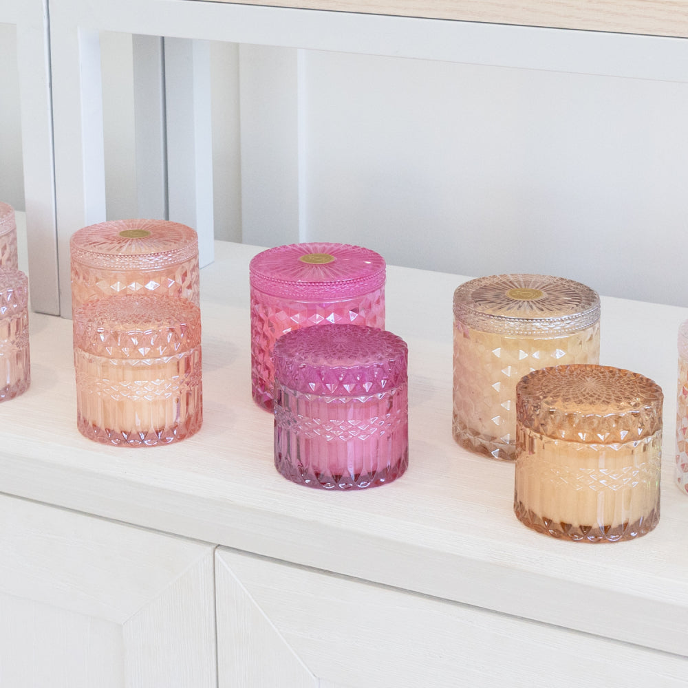 Indulge your senses with The SOi Co's luxurious home fragrance collection, thoughtfully crafted to elevate any space. Each SOi candle is meticulously hand-poured in the USA, using only the finest essential-infused fragrance oils and soy wax for an even, long-lasting and ultra-fragrant burn. The Shimmer Collection features an array of fragrances in diamond-cut glass vessels that glimmer as the fragrance burns, and a double wick for a fast fragrance release. With a lower melting point that allows for a better release of fragrance oils and a more consistent scent experience, each vessel is adorned with a glass-cut lid, adding an extra touch of elegance and sophistication, that also keeps dust and debris at bay. Each fragrance is offered in a uniquely coloured art deco-inspired glass, each hue representing the essence of the scent profile within.