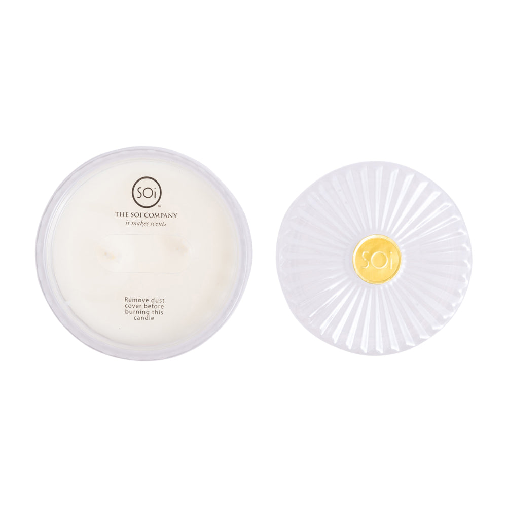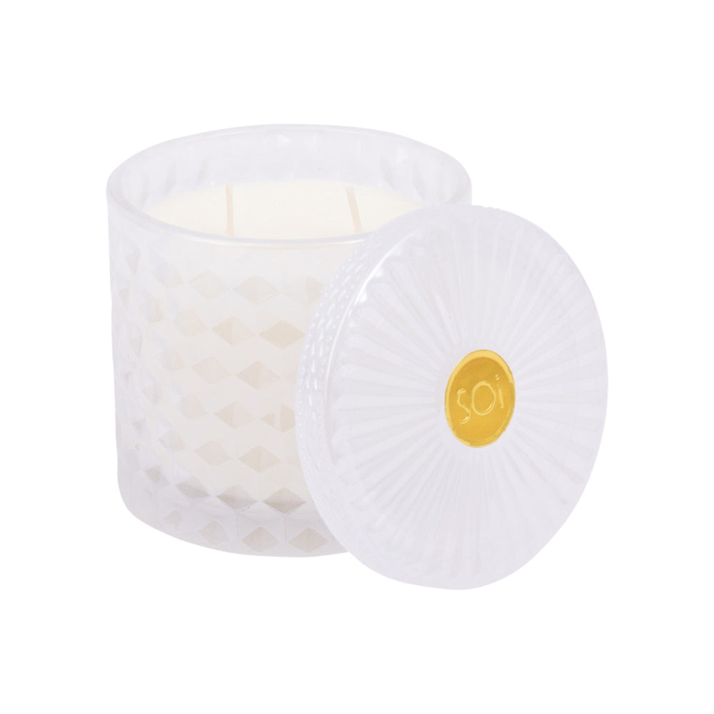 Indulge your senses with The SOi Co's luxurious home fragrance collection, thoughtfully crafted to elevate any space. Each SOi candle is meticulously hand-poured in the USA, using only the finest essential-infused fragrance oils and soy wax for an even, long-lasting and ultra-fragrant burn. The Shimmer Collection features an array of fragrances in diamond-cut glass vessels that glimmer as the fragrance burns, and a double wick for a fast fragrance release. With a lower melting point that allows for a better release of fragrance oils and a more consistent scent experience, each vessel is adorned with a glass-cut lid, adding an extra touch of elegance and sophistication, that also keeps dust and debris at bay. Each fragrance is offered in a uniquely coloured art deco-inspired glass, each hue representing the essence of the scent profile within.