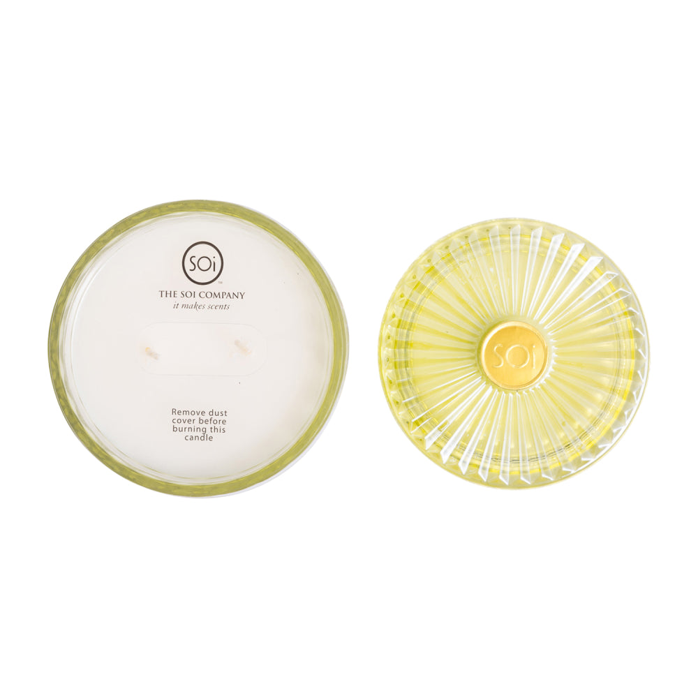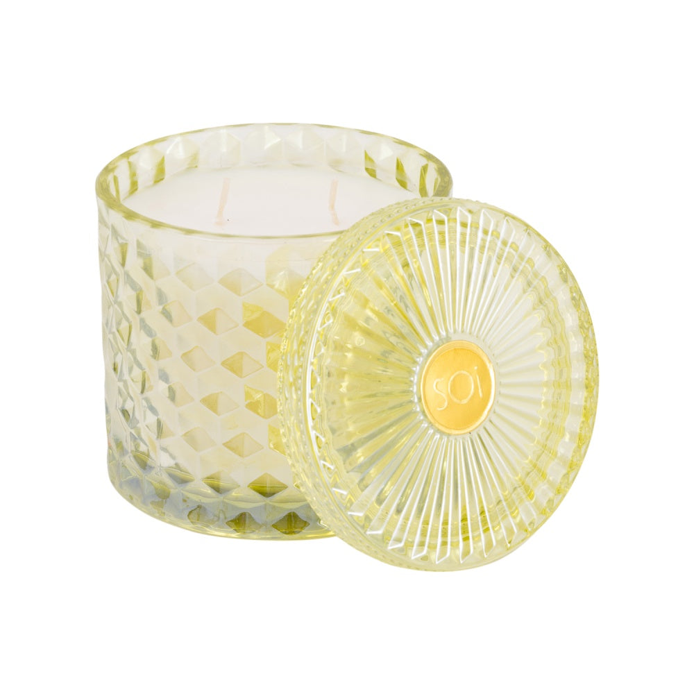 Indulge your senses with The SOi Co's luxurious home fragrance collection, thoughtfully crafted to elevate any space. Each SOi candle is meticulously hand-poured in the USA, using only the finest essential-infused fragrance oils and soy wax for an even, long-lasting and ultra-fragrant burn. The Shimmer Collection features an array of fragrances in diamond-cut glass vessels that glimmer as the fragrance burns, and a double wick for a fast fragrance release. With a lower melting point that allows for a better release of fragrance oils and a more consistent scent experience, each vessel is adorned with a glass-cut lid, adding an extra touch of elegance and sophistication, that also keeps dust and debris at bay. Each fragrance is offered in a uniquely coloured art deco-inspired glass, each hue representing the essence of the scent profile within.