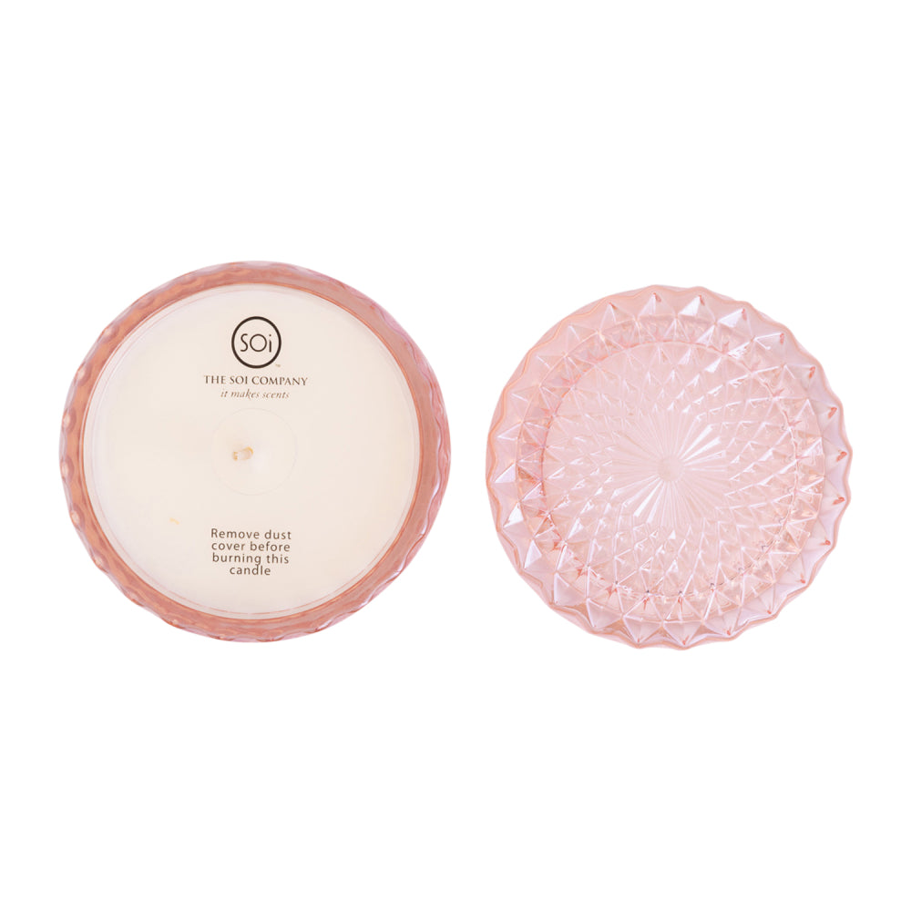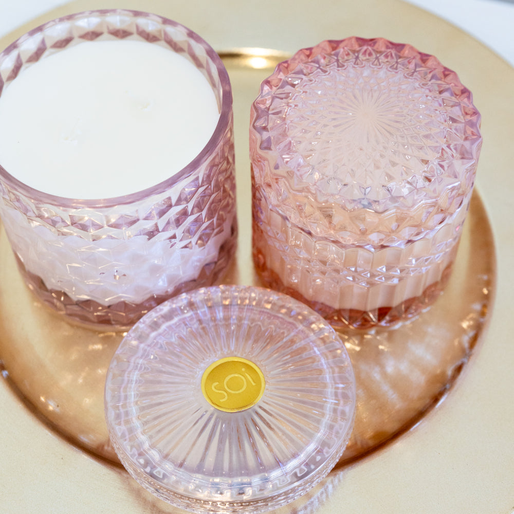 Indulge your senses with The SOi Co's luxurious home fragrance collection, thoughtfully crafted to elevate any space. Each SOi candle is meticulously hand-poured in the USA, using only the finest essential-infused fragrance oils and soy wax for an even, long-lasting and ultra-fragrant burn. The Petite Shimmer Collection features the cult-favourite diamond-cut glass vessels, in a smaller and more compact size. With a lower melting point that allows for a better release of fragrance oils and a more consistent scent experience, each vessel is adorned with a glass-cut lid, adding an extra touch of elegance and sophistication, that also keeps dust and debris at bay. Each fragrance is offered in a uniquely coloured art deco-inspired glass, each hue representing the essence of the scent profile within.