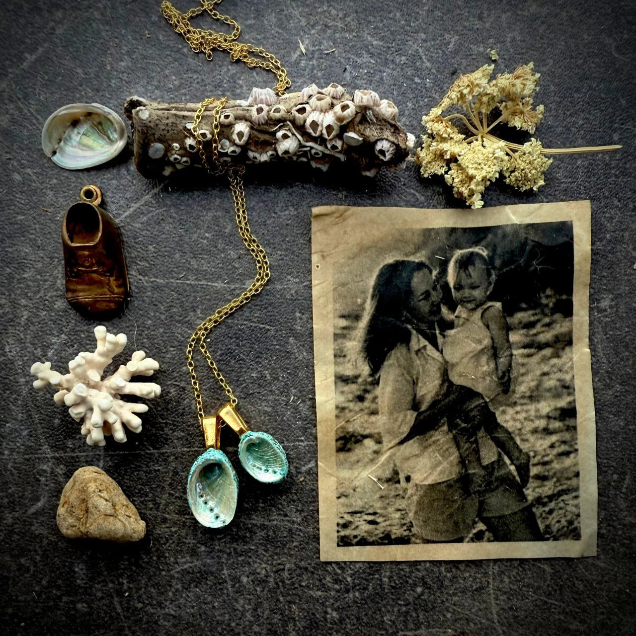 Two tiny farm pāua shells, side by side. Symbolising the bonds that keep us close.
