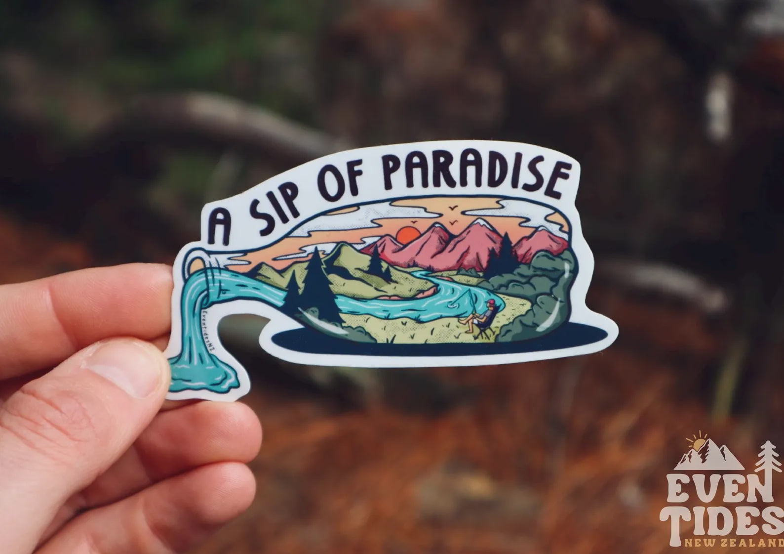 Eventides Stickers are homemade in Queenstown by local artist Luke Ridgeway