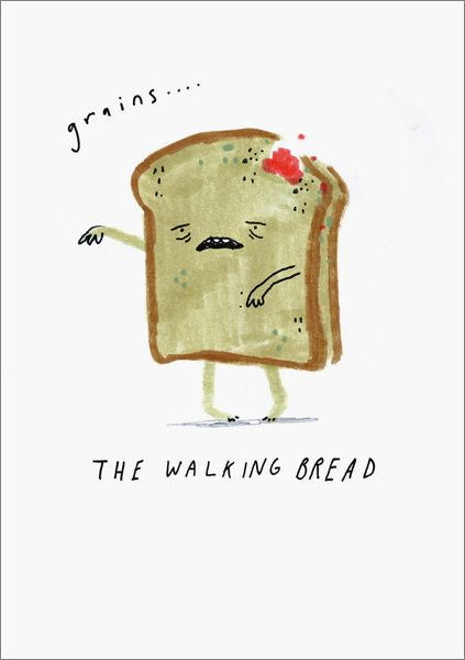 Card-The Walking Bread Designed by Alex Willmore 150x105mm Printed on FSC card Kraft envelope Plastic free packaging is coming. This card may come without a plastic sleeve, in it’s place is an easily removable sticker which holds the card and envelope securely together for display purposes