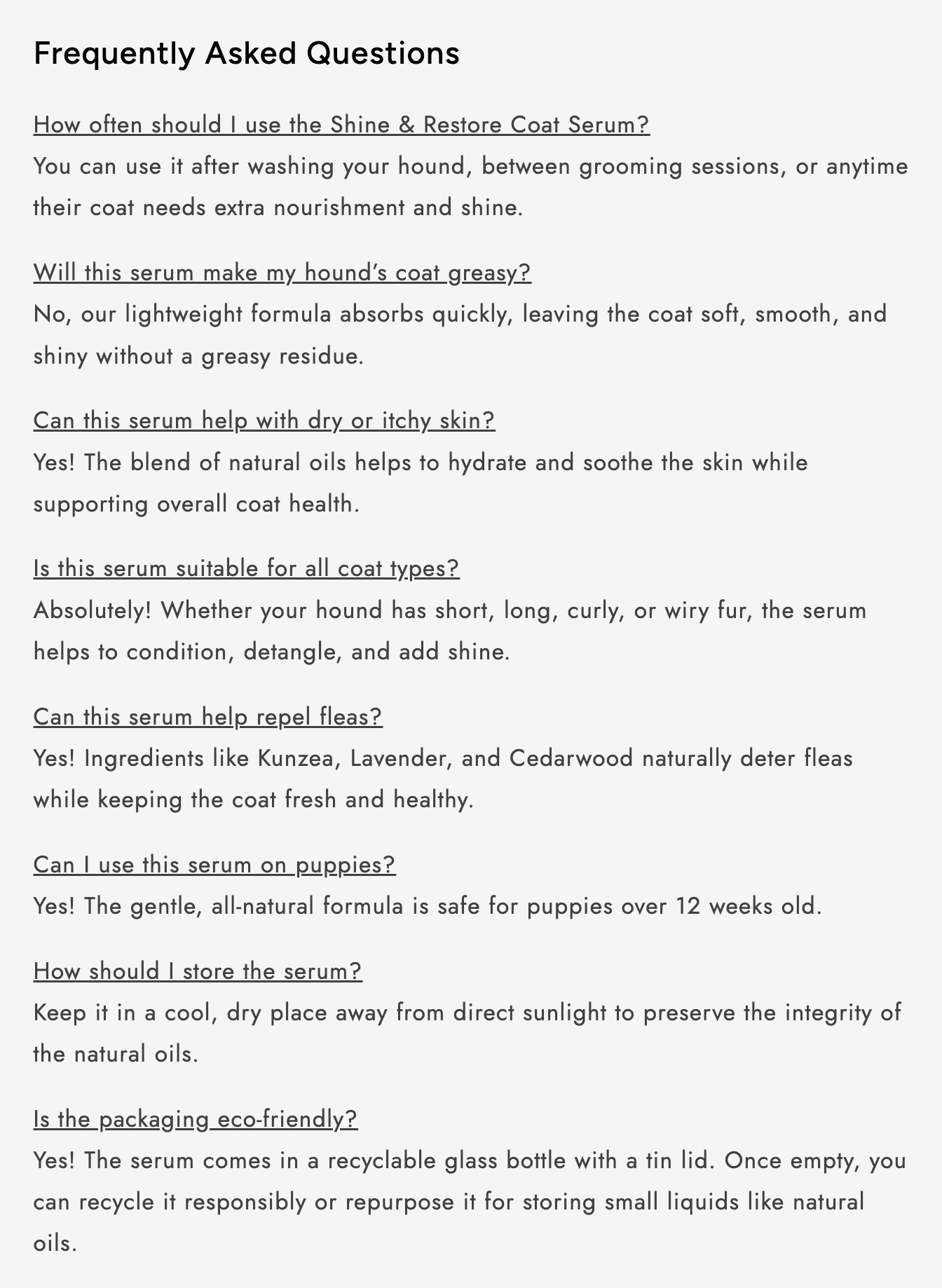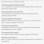Apply Serum into the palm of your hand. Use 2-4 drops for small breeds, and 4-6 drops for medium to large breeds. Gently run your hands through your hound’s fur, starting at the neck and working your way down to the tail. Brush through if desired (see benefits of brushing above). Your hound's coat will be left smooth, shiny, and smelling wonderfully houndish.