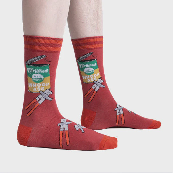 Yeah whoop a** comes organic! Pump yourself up and open a can, or just get some laughs with these funny socks and a stone cold stare.